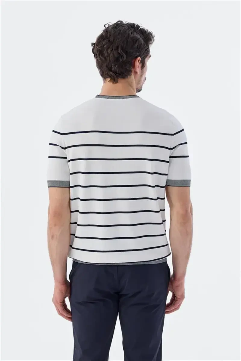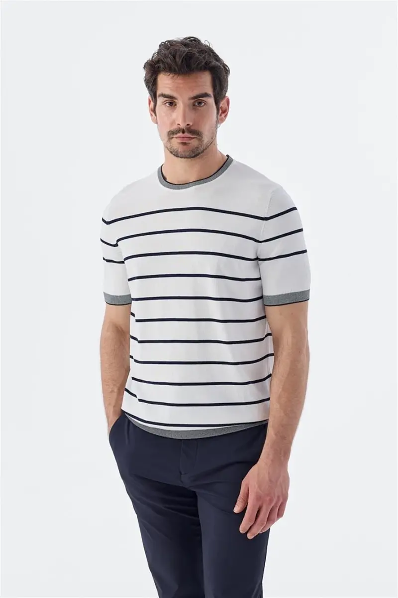 Для того чтобы изделие служило долго и сохраняло свой первоначальный вид, важно соблюдать инструкции по стирке. Мы рекомендуем стирать изделие вручную или использовать деликатный режим стирки. При глажке следует использовать низкую температуру и гладить изделие с изнанки, чтобы избежать повреждения ткани. Пожалуйста, избегайте попадания прямых солнечных лучей на изделие. По любым вопросам или запросам не стесняйтесь обращаться в нашу службу поддержки. Мы здесь, чтобы обеспечить вам наилучшее обслуживание. Если вы ищете качественную и стильную футболку, бело-синяя полосатая трикотажная футболка Slim Fit с круглым вырезом — это именно то, что вам нужно!