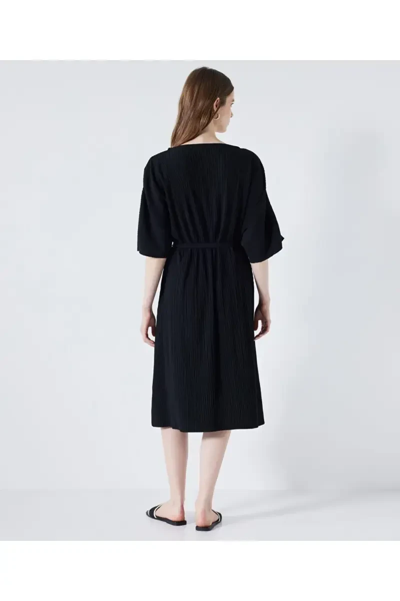 Own a piece that will become a staple in your wardrobe with the Black Belted Midi Dress. This stylish and elegant dress will make you stand out in any environment with its modern design and comfortable cut. Its midi length is the perfect choice for both daily use and special occasions. The classic and sophisticated stance of black adds a timeless elegance to the dress, while the belt detail emphasizes your waist, helping you create a more feminine silhouette. This dress offers comfortable use all day long thanks to its high-quality fabric and does not restrict your freedom of movement. Whether you make a stylish combination with heels or create a more relaxed style with sandals, the Black Belted Midi Dress will always add elegance to your style. Ideal for all kinds of events, from business meetings to dinners, from special invitations to daily outings, this dress is a candidate to be one of the most used pieces in your wardrobe. The texture of the fabric provides a soft touch to your skin, while its draped structure adapts to your movements. The cut of the dress gently follows your body lines, helping you achieve a flawless look. The nobility of black and the modernity of the midi length come together to offer you both a stylish and comfortable experience. Elevate your style with the Black Belted Midi Dress and make a difference in every environment. This piece, which must be in your closet, will always give you confidence and elegance. With this dress, you will not only dress, but also feel special.
