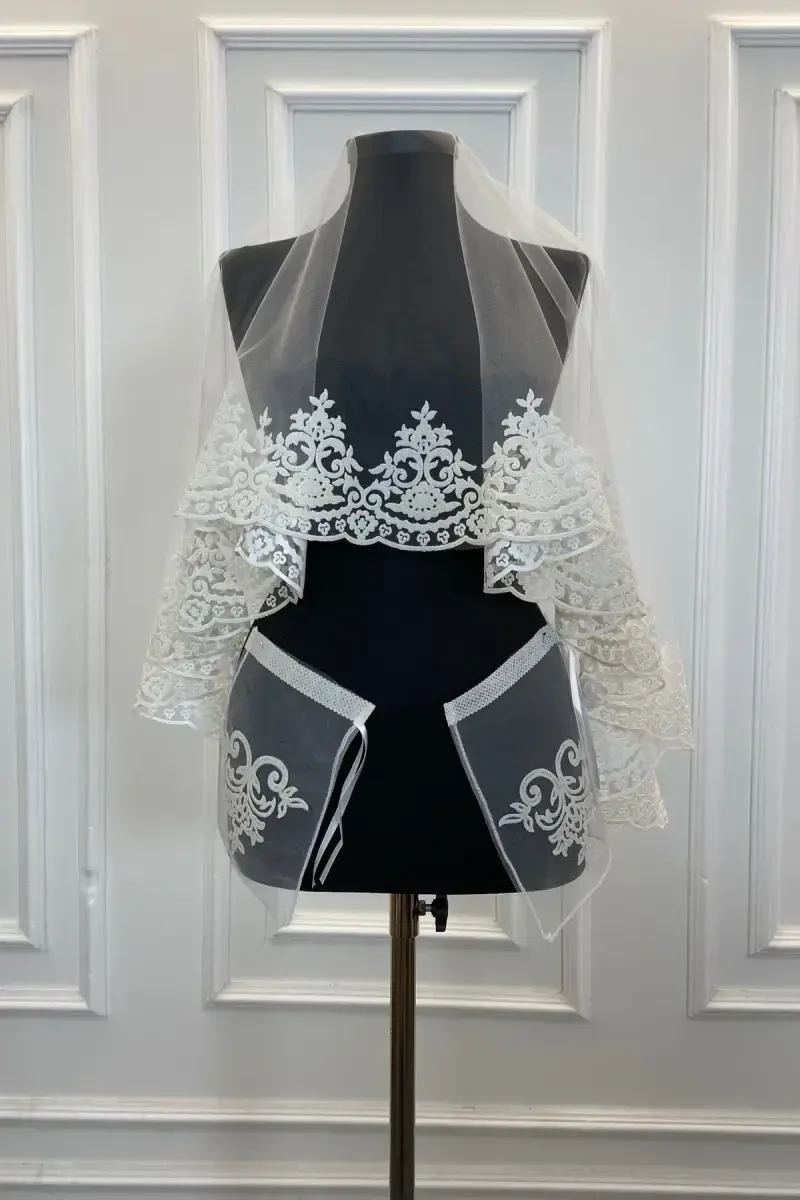Белый Свадебный Фата Комплект Классический Узор Флок Печать С Блестками Хна Фата-FLOKKLASİKBEYAZ