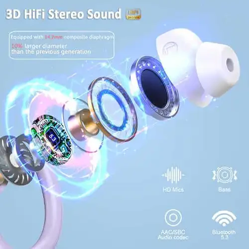 Эти высококачественные беспроводные наушники - идеальный выбор для спорта, тренировок и повседневного использования. Новейшая технология Bluetooth 5.3 обеспечивает сверхбыстрое и стабильное подключение, а 3D HiFi стереозвук позволяет вам услышать каждую деталь вашей музыки. Мощные басы и кристально чистые высокие частоты выведут ваш опыт прослушивания музыки на новый уровень.