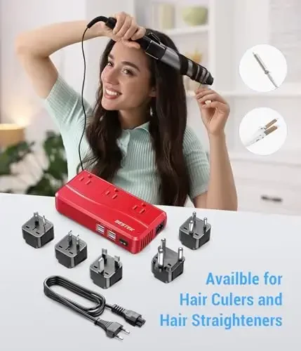 BESTEK Xalqaro Quvvat Adapteri 250 Vt, Sayohat uchun 220 V dan 110 V gacha bo'lgan Kuchlanish Konvertori, 4 Portli USB, shu jumladan AQSh/AU/EU/UK/Hindiston/Janubiy Afrika vilkasi Adapteri (Qizil)