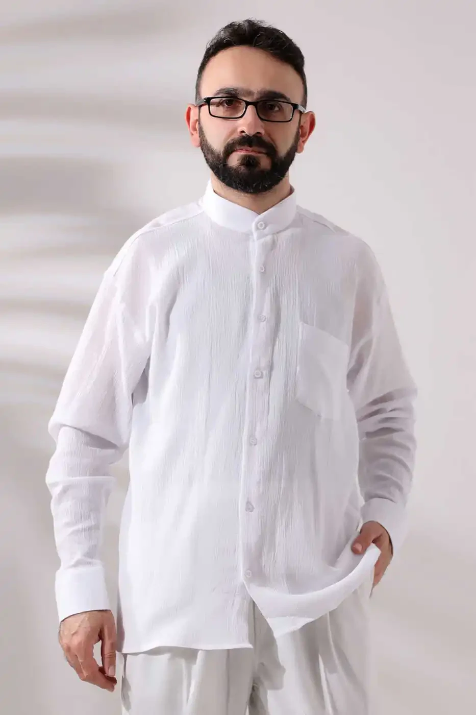 Beyaz Çınar Erkek Rahat Kesim Hakim Yaka Şile Bezi Hac Ve Umre Gömlek, hac ve umre ibadetleriniz sırasında hem rahatlık hem de şıklık sunmak için tasarlanmıştır. %100 pamuk şilebezi kumaştan üretilen bu gömlek, tam yazlık olup, serin tutar ve terletmez. Bol kesimi sayesinde gün boyu konfor sağlar ve vücuda yapışmaz.