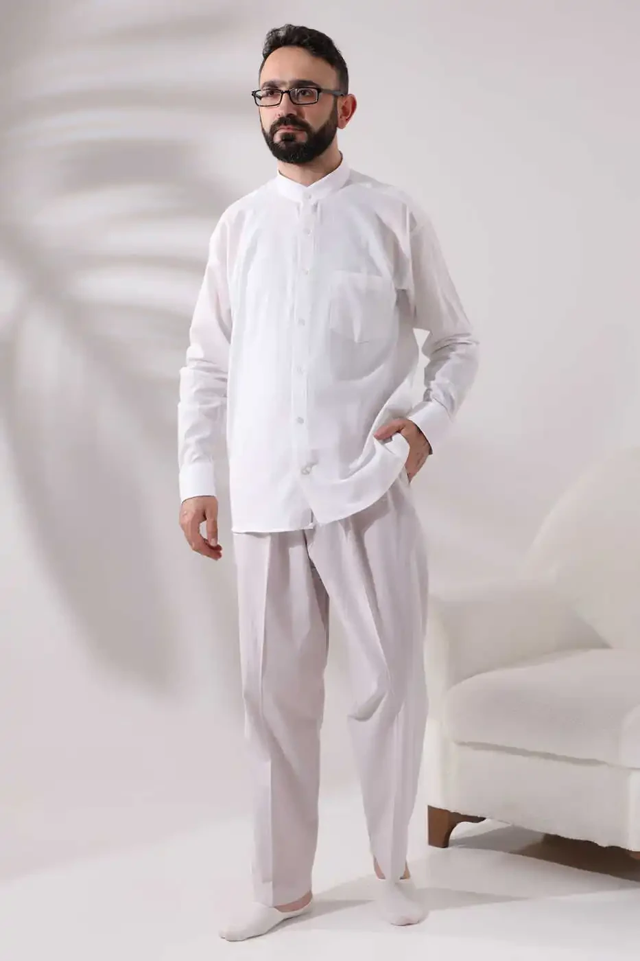 Белая мужская свободная однокарманная рубашка с воротником-стойкой для хаджа и умры изо льна отличается прохладой и комфортом. Благодаря 100% льняной ткани она обеспечивает воздухопроницаемость и прочность. Свободный крой обеспечивает свободу движений, а дизайн с одним карманом добавляет практичности для небольших предметов. Деталь воротника-стойки создает простой и стильный образ. Эта рубашка, специально разработанная для паломничества в хадж и умру, также может удобно использоваться в повседневной жизни.