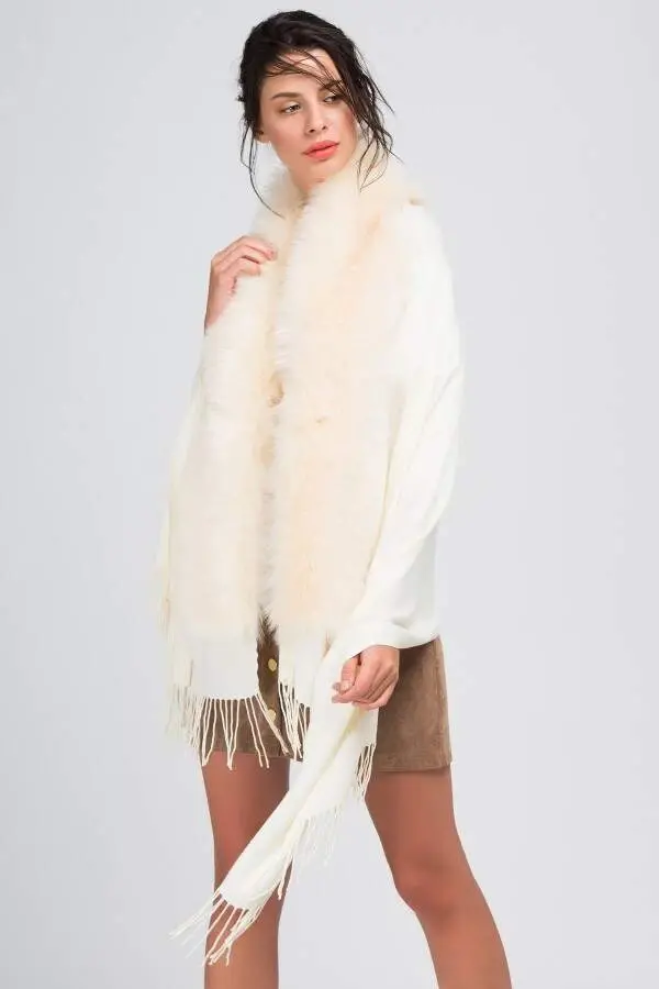 Beyaz Kürklü Püsküllü Panço | Şık ve Sıcak Tutucu