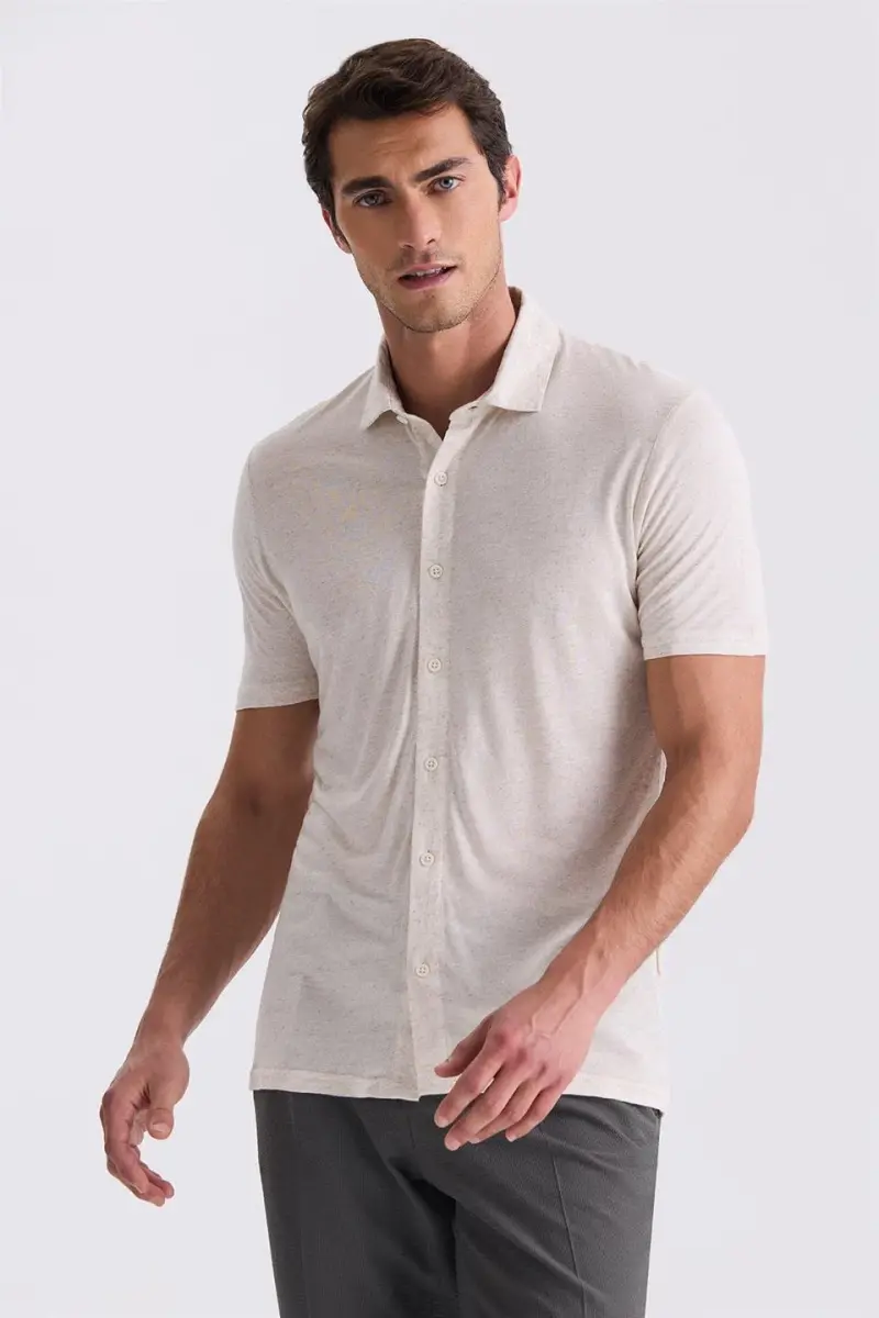 Бежевая приталенная футболка с воротником в рубашечном стиле, смесь вискозы и льна, деталь средней горловины, приталенный крой