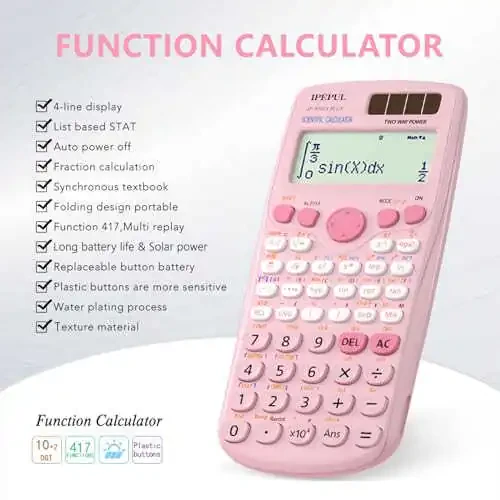 417 Calculation Functions: The scientific calculators has 417 different calculation function built-in, including trigonometric function, exponential function, logaritModazoneic function, calculus, statistics, algebra, and other advanced mathematical functions. It also supports complex number calculations, matrix calculations, vector calculations, etc., and can meet the various scientific and engineering calculation needs . Large Screen Four-Line Display: The scientific calculator adopts a four-line large screen design, which is convenient for users to read. It also supports the natural display, which can directly display the input and output of mathematical formulas on the screen, making complex calculations more intuitive.The key SHITT -MODE (SETUP) DOWN -6( LEFT Continue RIGHT ).Use LEFT and RIGHT to adjust screen brightness . Dual Power: This calculator has a built-in solar panel and durable battery, which can be used continuously for many years in indoor and outdoor environments, reducing the frequency of battery replacement and making it more economical. This also makes it the best choice for people who need to use it for a long time, such as school supplies, high school students, accountants, and non-programmable calculators . Multi-Functional Keyboard: The calculator has a keyboard with many scientific symbols and function keys built-in, making it easy to perform various calculations and functions. Especially for people who need to perform scientific calculations frequently, this keyboard design can greatly improve their calculation efficiency, such as teachers, engineers, college students, nurses, and accountants . The Best Gift: This calculator is very suitable for students in elementary school, junior high school, high school, college, engineers, nurses, and teachers, etc. It can meet their calculation needs in the fields of mathematics, science, and engineering, and help them better understand and apply knowledge. Therefore, as a gift, it can be given to these people who need to perform scientific calculations.𝐂𝐎𝐍𝐓𝐀𝐂𝐓 𝐔𝐒 𝐅𝐎𝐑 𝐄𝐋𝐄𝐂𝐓𝐑𝐎𝐍𝐈𝐂 𝐔𝐒𝐄𝐑’𝐒 𝐆𝐔𝐈𝐃𝐄 .