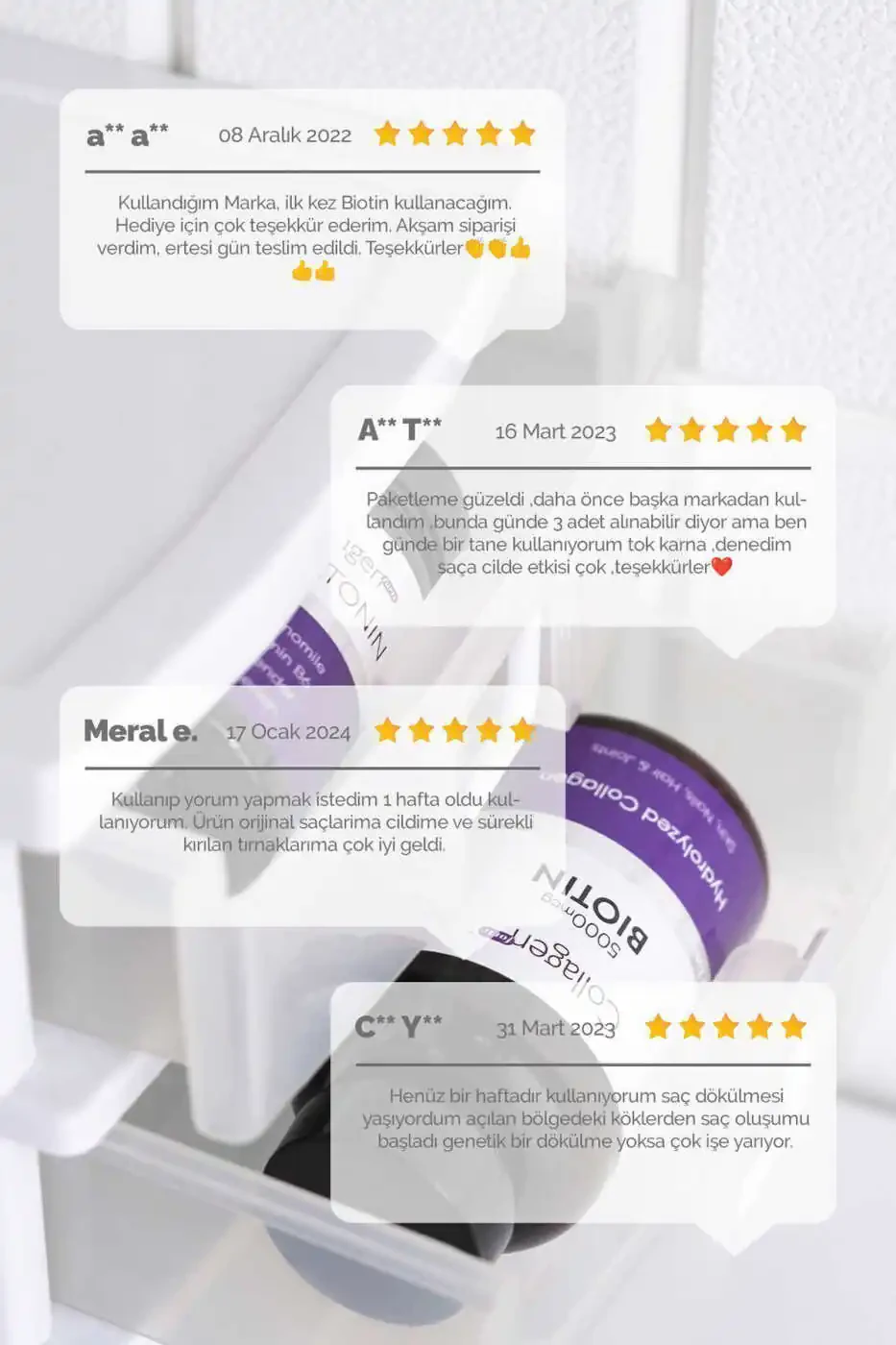 Biotin is a B vitamin that is important for hair, skin, and nail health. It promotes hair growth, reduces hair loss, and helps hair strands become stronger and healthier. Collagen strengthens hair follicles, supports hair growth, and makes hair appear fuller and shinier.