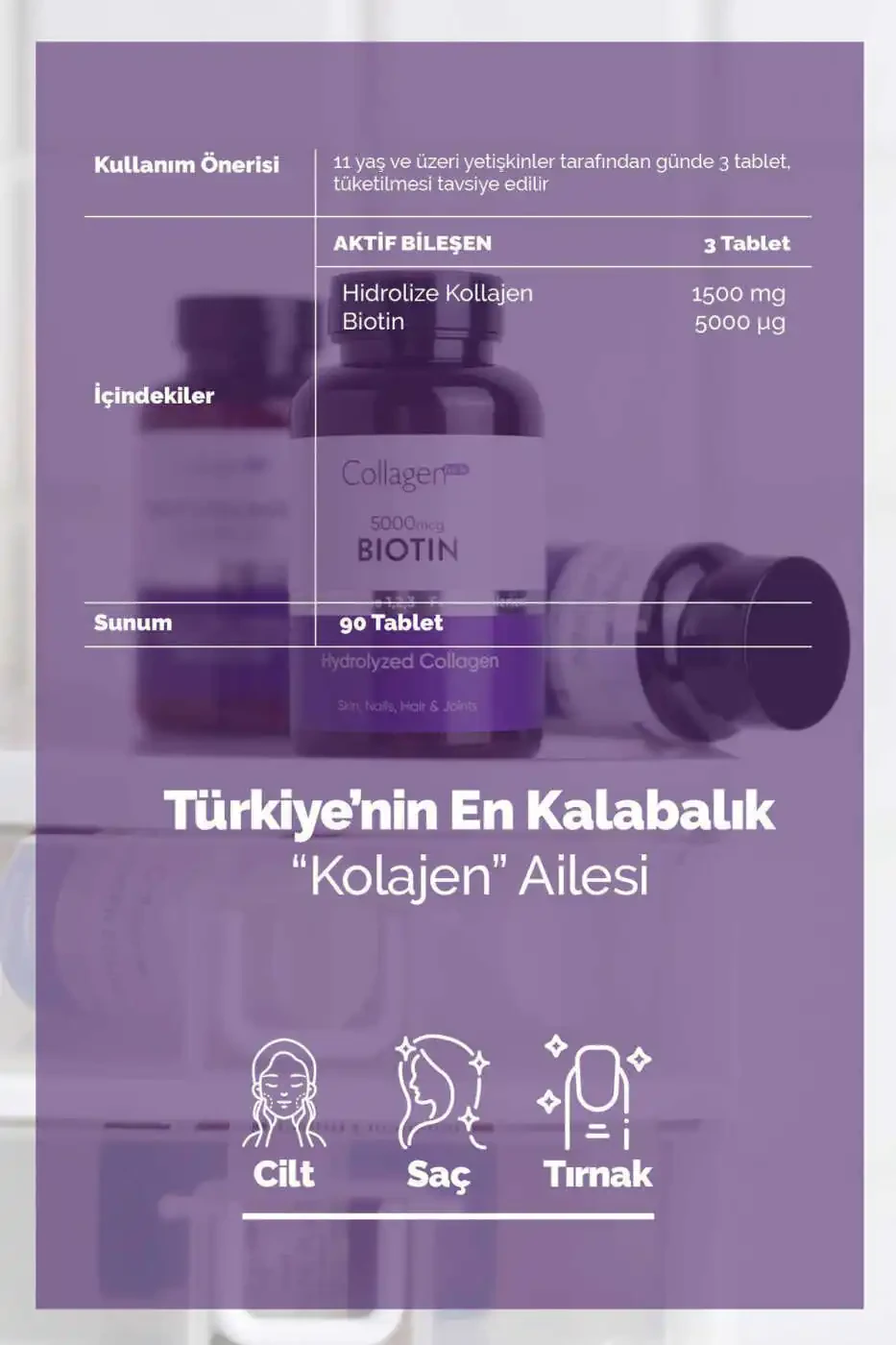 Biotin 5000mcg & Kollagen 1500mg sochingizning barcha kerakli ozuqalarini ta'minlaydi. Har bir tabletka 5000mcg biotin va 1500mg kollagenni o'z ichiga oladi. Ushbu maxsus formula sochingizning sog'lomroq, kuchliroq va jonliroq ko'rinishiga yordam beradi.