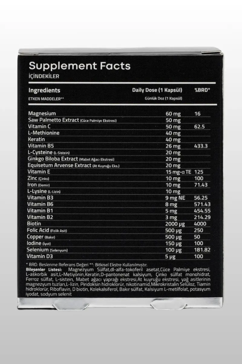 Биотин, входящий в состав нашей формулы, необходим для роста и здоровья ваших волос. Кератин является строительным блоком ваших волос и помогает укрепить волосы и улучшить их состояние. Наша формула также содержит цинк, железо, витамины группы B и другие важные витамины и минералы, которые способствуют питанию и укреплению ваших волос.