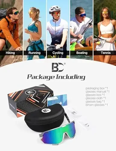 BIRCEN Baseball Cycling Sunglasses разработаны с учетом потребностей спортсменов. Благодаря высокопроизводительным линзам и прочной конструкции их можно безопасно использовать в любых погодных условиях и во время занятий спортом. Они защищают здоровье ваших глаз, а также предлагают стильный вид. Чехол для переноски и ткань для очистки, входящие в комплект поставки, помогут вам безопасно хранить и содержать очки в чистоте. Пожалуйста, внимательно прочитайте инструкцию по эксплуатации и используйте очки правильно.