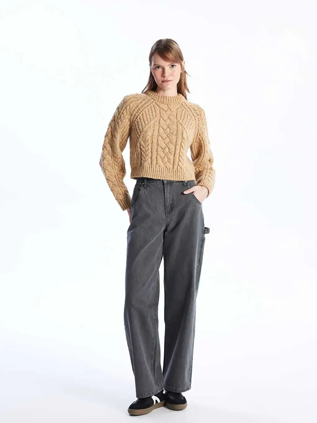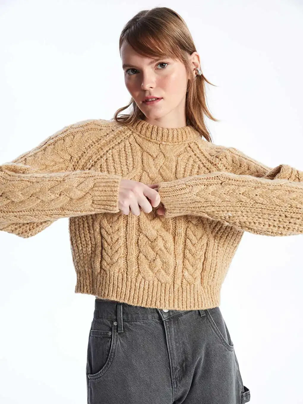 Bisiklet Yaka Yumuşak Dokulu Saç Örgü Desenli Triko Kazak - Camel Renk