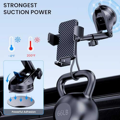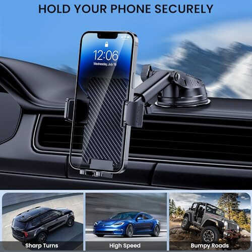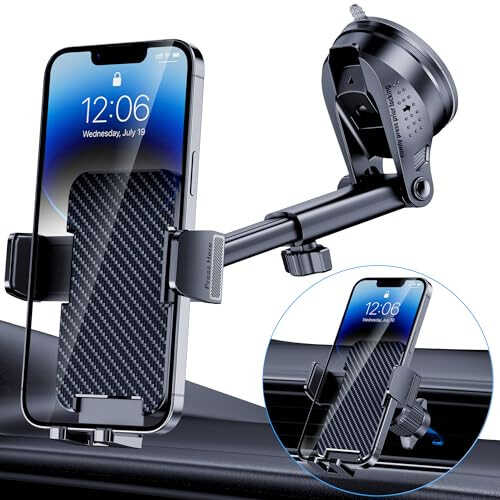 Super Strong Suction Cup: Upgraded TPU Cell Phone Car Mount equipped with a layer of adhesive gel for improved heat resistance and stronger adhesion. The suction cup can be cleaned and reused. iPhone car mount can be securely installed on the windshield, dashboard and air vent; Comes with an extra 3M adhesive dashboard pad for enhanced suction on uneven surfaces. NOTE: It is recommended to install on smooth and stable surfaces. Thick Cases Friendly: Windshield phone mount for car features wider arms and adjustable feet to accommodate large-sized phones 4.0-7.1inch and cases up to 14mm thick. The reinforced vacuum airbag silicone arms provide a stable grip and protection, ensuring that your iPhone remains scratch-free. Adjustable Telescopic Arm: iPhone holder for car has a 360-degree ball joint and an adjustable telescopic arm that extends from 2.8 inches to 5.0 inches and can be adjusted up and down by 270 degrees. It offers unlimited viewing angles whether mounted on the dashboard or windshield. The ball joint allows for both horizontal and vertical phone rotation, preventing obstruction of the driver's view while driving. Upgraded Metal Hook: Phone stand for car features an upgraded metal hook with a thick plastic layer wrapped around outside which firmly locking the vent blades without scratches. The vent cilp fit for all 0-3.5mm width air vent blades. A good assistant for taxi and Uber drivers. Easy Installation: Dashboard phone holder features a one-touch release system. Simply touch it gently with your finger to easily install or remove the phone from the mount. It frees your hands completely, allowing for safe driving.