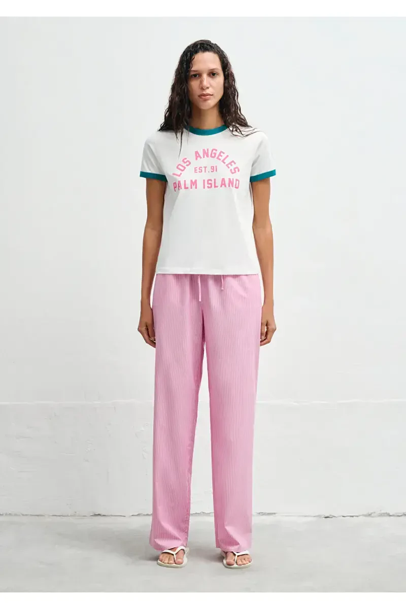 Изготовлено из смесовой ткани с хлопком. Круглый вырез. Короткий рукав. С принтом. С отделкой бейкой. Стандартный крой / Обычный.