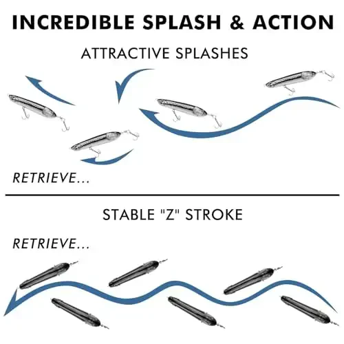 TRUSCEND Top Water Fishing Lures выделяются своим уникальным дизайном хвостовой части с двойным лезвием. Этот дизайн создает интенсивный звук и вибрацию при движении по поверхности воды, привлекая и соблазняя рыбу. Эта приманка, эффективно работающая на разных скоростях, также устойчива к "перекатыванию". Интересно, что когда крупный окунь атакует приманку, хвост закрывается, не позволяя рыбе выплюнуть приманку, что увеличивает ваши шансы на поимку.