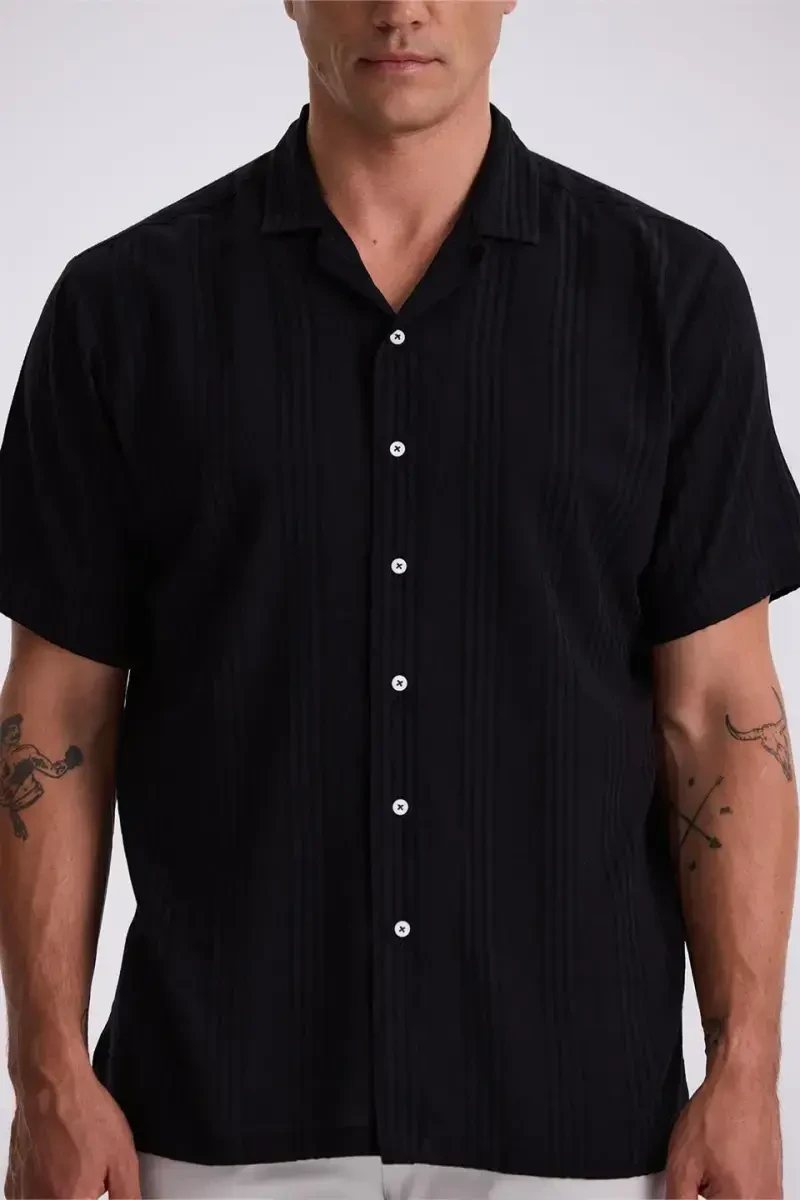 Black Classic Fit Mandarin Collar Short-Sleeve Shirt | 70% Cotton, 30% Linen