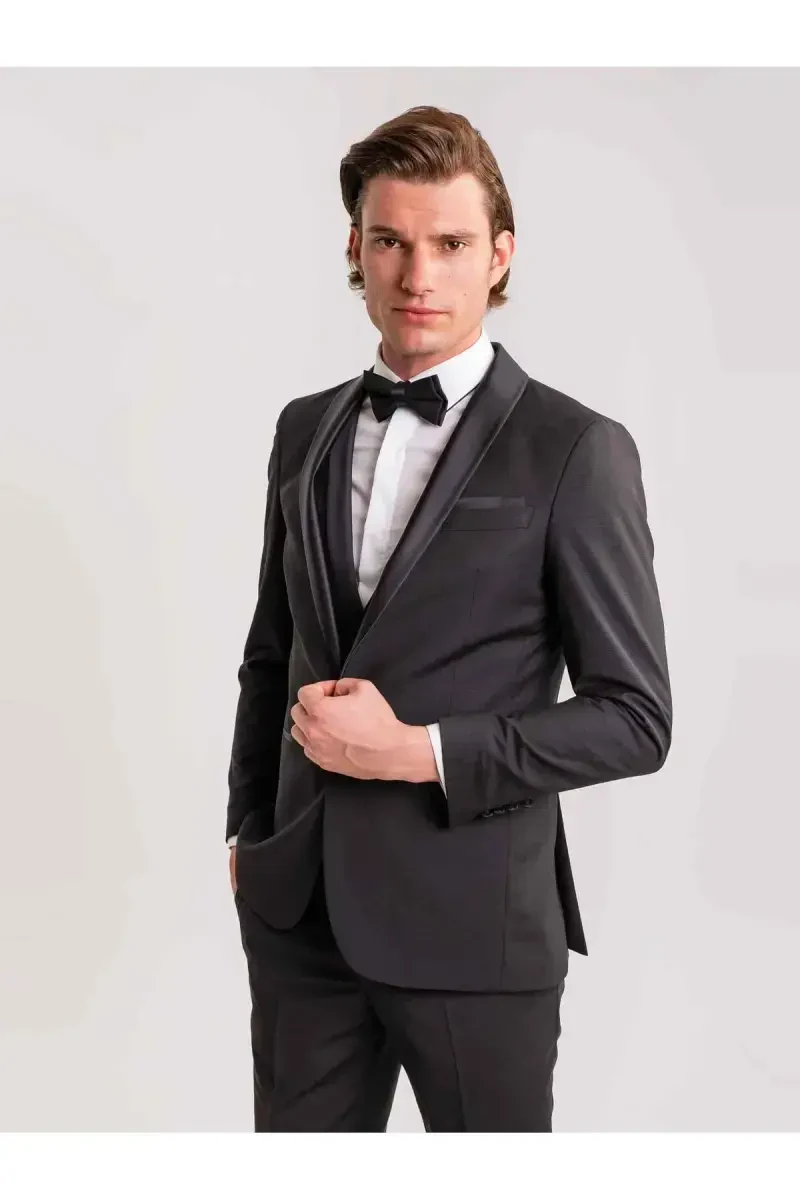 Make a statement of elegance at your special occasions and events with the Black Men's Modern Fit Striped Shawl Collar Tuxedo Suit - 61335-BLACK. This tuxedo suit, offered with Dufy quality, attracts attention with its modern cut and elegant striped pattern. The shawl collar detail adds a sophisticated touch to the suit, while the modern fit cut provides a perfect look with its body-hugging structure. The fabric blend of 60% Polyester, 20% Viscose, 18% Wool, and 2% Elastane offers both a stylish appearance and comfortable wear throughout the day. This special design tuxedo suit will accompany you in all kinds of events, from weddings to business meetings, special invitations to gala nights. The wool content in the fabric adds warmth and a luxurious touch to the suit, while the viscose and polyester blend offers durability and easy ironing. Elastane ensures that it fits you perfectly without restricting your freedom of movement. This tuxedo suit, which should be in the wardrobe of the modern man, is the most stylish way to reflect your style and make a difference. You can create an unforgettable style by combining it with accessories that will complement your elegance. Whether you use it with a classic bow tie and patent leather shoes, or with a more modern tie and leather shoes, you will dazzle in any case. This special design by Dufy will make you feel special with its quality and elegance. Remember, style is a stance and this tuxedo suit will allow you to reflect your stance in the best way. This product may be offered for sale by more than one seller. Sellers are listed by considering the price they set for the product, seller scores, delivery statuses, promotions, cargo status, delivery speed, stock information and category information. Order this special tuxedo suit now to complete your elegance and style and reveal your difference!