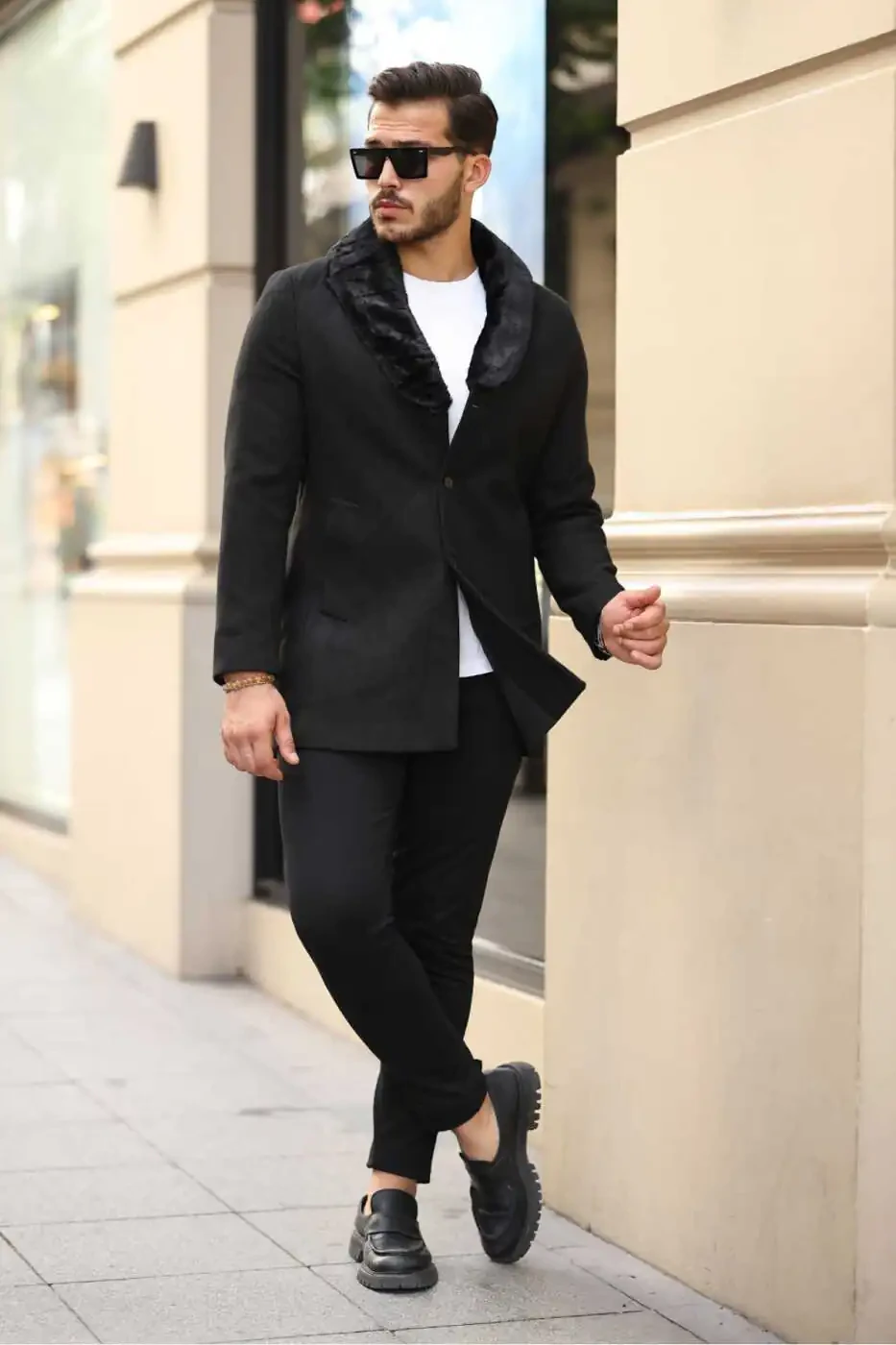 Get a stylish and warm look with the Men's Slim Fit Fur Collar Wool Coat Black this winter. Order now!