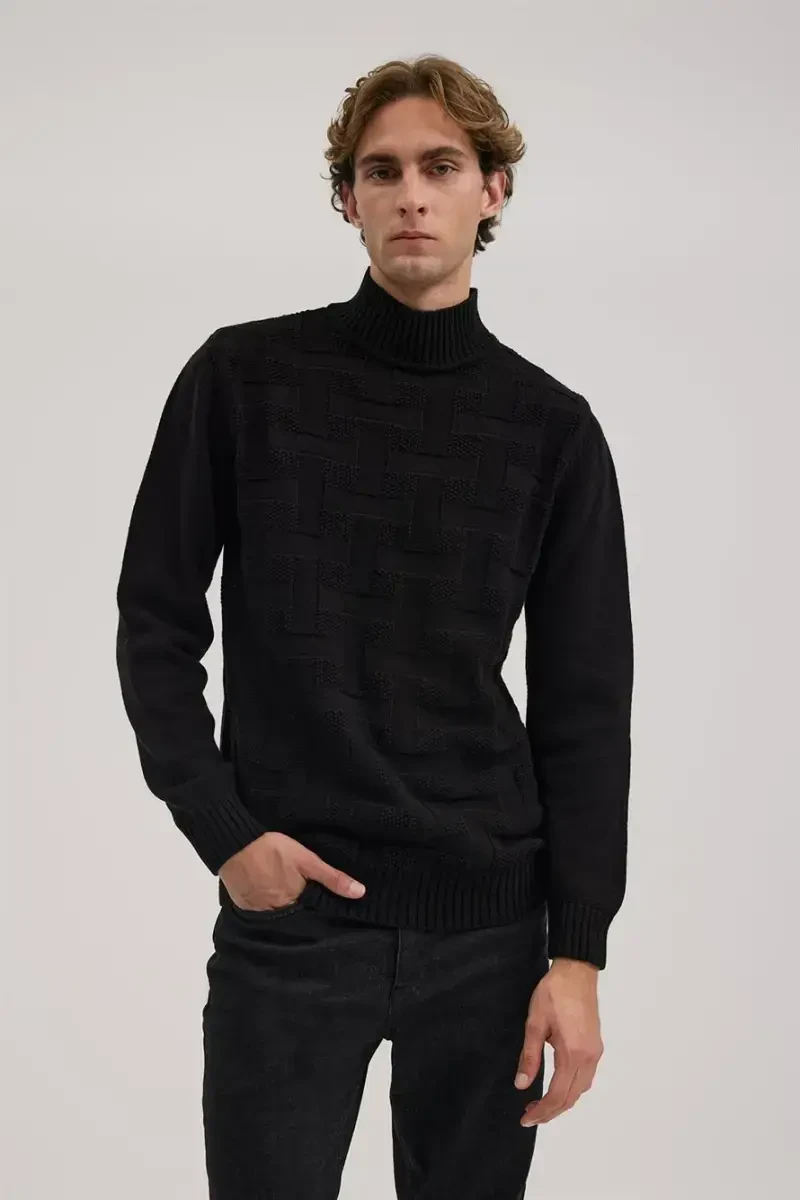 Bring your style and comfort together with the Black Slim Fit Patterned Cotton Turtleneck Knitwear! This knitwear, specially designed for men who want to look stylish and stay warm in cold weather, is a candidate to be an indispensable part of your wardrobe. Made of high-quality 100% cotton yarn, this knitwear gently touches your skin and offers all-day comfort. Thanks to the natural breathability of cotton, it prevents sweating and allows your skin to breathe.The slim fit cut elegantly reveals the lines of your body and creates a modern silhouette. This cut helps you achieve a stylish look in both daily use and special occasions. The turtleneck model completely wraps your neck, preventing cold air from entering and keeping you warm. The turtleneck also adds a sophisticated touch to your outfit.The patterned design on the knitwear adds movement to simplicity and allows you to reflect your style. The pattern adds a unique touch to the knitwear while maintaining its easy combinability. You can easily combine it with jeans, chinos or fabric trousers to create different styles.The black color matches all kinds of clothes and highlights your elegance. Whether you adopt a classic style or want to achieve a more sporty look, this knitwear will always be the right choice.Black Slim Fit Patterned Cotton Turtleneck Knitwear offers not only a garment but also a lifestyle. Feel good in any environment with this knitwear that combines quality material, stylish design and superior comfort. This knitwear, which keeps you warm and looks stylish, will be indispensable in winter months. In addition to daily use, you can easily prefer it in the office, invitations or special events.This knitwear is carefully designed for long-lasting use. Thanks to its quality stitching and durable material, it will keep its place in your wardrobe for many years. You can ensure that your knitwear looks like the first day with proper care. You can safely wash your knitwear by following the washing instructions on the label and use it for a long time.Defy the cold weather and let your style speak with the Black Slim Fit Patterned Cotton Turtleneck Knitwear! Order now and complete your wardrobe with this stylish and useful knitwear.