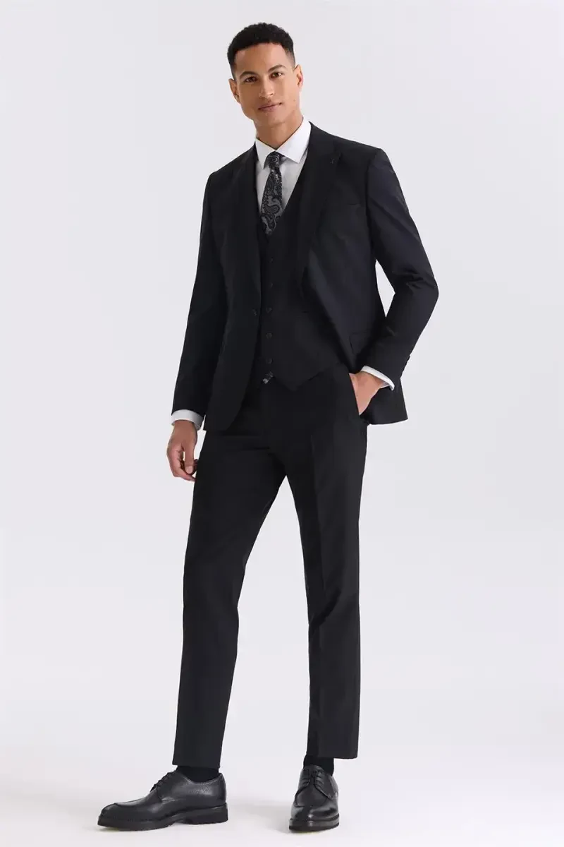 **Black Slim Fit Peak Lapel Waistcoat Wool Suit**Designed for the discerning man who demands impeccable style and sophistication, this black suit will make you stand out at any special occasion.**Premium Fabric:**Crafted from a luxurious blend of 75% wool, 22% polyester, and 3% elastane, this suit exudes durability, softness, and comfort.**Slim Fit Tailoring:**The suit features a modern and sleek slim fit that contours your body, creating a sharp silhouette from shoulder to hem.**Peak Lapel Waistcoat:**Adding an extra touch of elegance, the suit comes complete with a stylish peak lapel waistcoat. The waistcoat elevates the suit's style and exudes a sophisticated presence.**Perfect Fit:**Model measurements:* Height: 187 Cm* Weight: 78 Kg* Shoulders: 120 Cm* Chest: 100 Cm* Waist: 80 Cm* Hips: 100 CmThe model is wearing a size 50 suit.**Versatile Styling:**This suit is ideal for both formal and semi-formal events. It is a perfect choice for weddings, galas, or business meetings.**Care Instructions:*** Dry clean recommended* Use low heat when ironingElevate your style and exude confidence with this black slim fit peak lapel waistcoat wool suit.