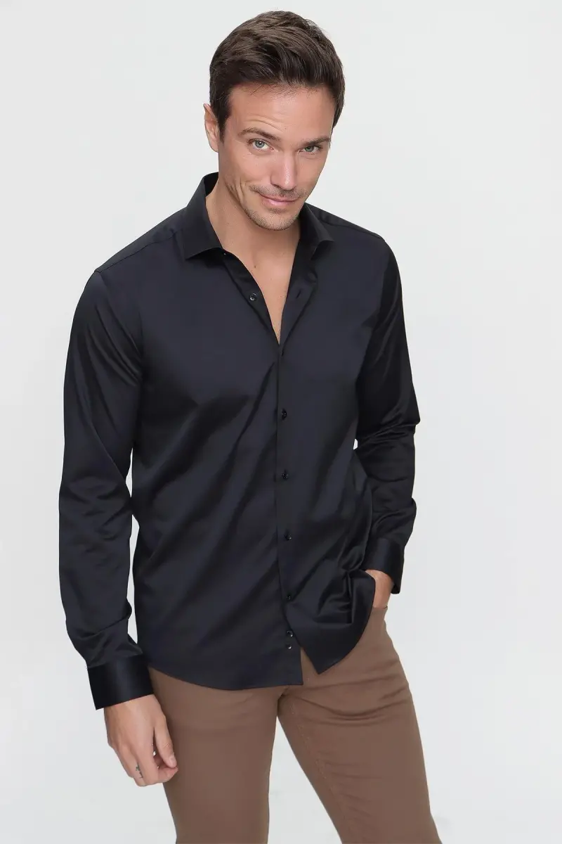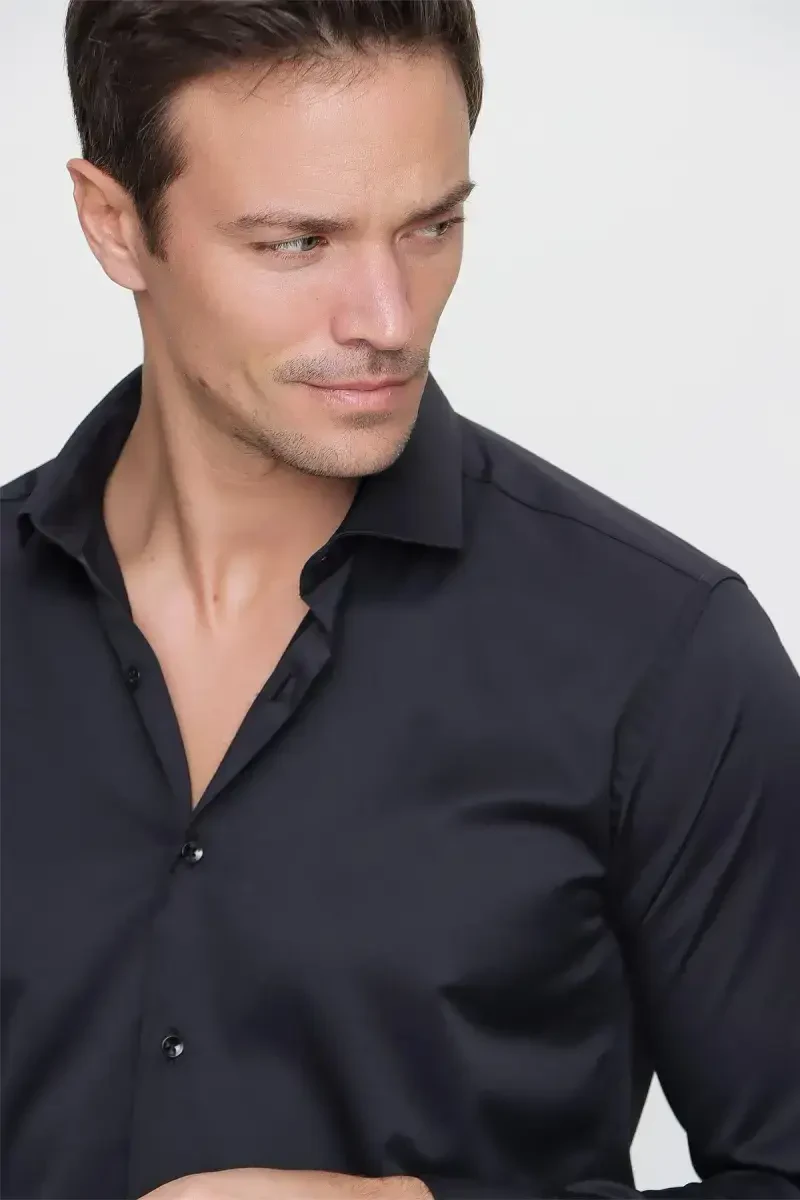 Black Slim Fit Straight Stiff Collar Easy Ironing Long Sleeve Shirt is a timeless piece that should be in the wardrobe of the modern man. Combining both elegance and practicality, this shirt is ready to accompany you in any environment, from your special occasions to business meetings. Thanks to its slim fit cut that fits your body, this shirt creates an elegant silhouette and increases your self-confidence. The straight and stiff collar is suitable for use with or without a tie, offering a well-groomed and professional look at all times. Thanks to the special texture of its fabric, it is easy to iron, thus saving you time in your busy schedule. The long-sleeved design offers an ideal use in seasonal transitions and cool weather, while preventing you from sacrificing your elegance. Combining the elegance of black and the harmony of modern cut, this shirt is a candidate to be indispensable for stylish men. This shirt not only offers a stylish look, but also provides a comfortable wearing experience. Thanks to its high-quality fabric, you will feel comfortable all day long. Its non-sweating and breathable structure provides you with an advantage, especially on long and busy days. The stitching details of the shirt are carefully designed for long-lasting use. The buttons are selected in accordance with the quality of the fabric and complement the overall aesthetics of the shirt. This shirt will be one of the basic pieces of your wardrobe and will easily match with different combinations. Whether you combine it with a classic suit or a daily jean, it always ensures you look stylish and well-groomed. Presented with a special gift box, it offers a meaningful and useful gift option that you can give to your loved ones. Reflect your style with the Black Slim Fit Straight Stiff Collar Easy Ironing Long Sleeve Shirt and attract attention in any environment. This shirt is an excellent option that meets the needs of the modern man and complements his style. With this special piece that should be in your wardrobe, always feel stylish and confident.Product DescriptionBlack Slim Fit Straight Stiff Collar Easy Ironing Long Sleeve Shirt is a timeless piece that should be in the wardrobe of the modern man. Combining both elegance and practicality, this shirt is ready to accompany you in any environment, from your special occasions to business meetings. Thanks to its slim fit cut that fits your body, this shirt creates an elegant silhouette and increases your self-confidence. The straight and stiff collar is suitable for use with or without a tie, offering a well-groomed and professional look at all times. Thanks to the special texture of its fabric, it is easy to iron, thus saving you time in your busy schedule. The long-sleeved design offers an ideal use in seasonal transitions and cool weather, while preventing you from sacrificing your elegance. Combining the elegance of black and the harmony of modern cut, this shirt is a candidate to be indispensable for stylish men. Thanks to its high-quality fabric, you will feel comfortable all day long. Its non-sweating and breathable structure provides you with an advantage, especially on long and busy days. The stitching details of the shirt are carefully designed for long-lasting use. The buttons are selected in accordance with the quality of the fabric and complement the overall aesthetics of the shirt. Presented with a special gift box, it offers a meaningful and useful gift option that you can give to your loved ones.Product Features* Slim Fit Cut* Straight and Stiff Collar* Easy Ironing Fabric* Long Sleeve Design* High Quality Fabric* Breathable Structure* Stylish Button Details* Careful Stitching Workmanship* Gift Boxed Packaging* Black ColorAdditional InformationTo use your shirt for a long time, follow the washing instructions on the label. Wash with dark colored clothes. Your product will be sent in a gift box.