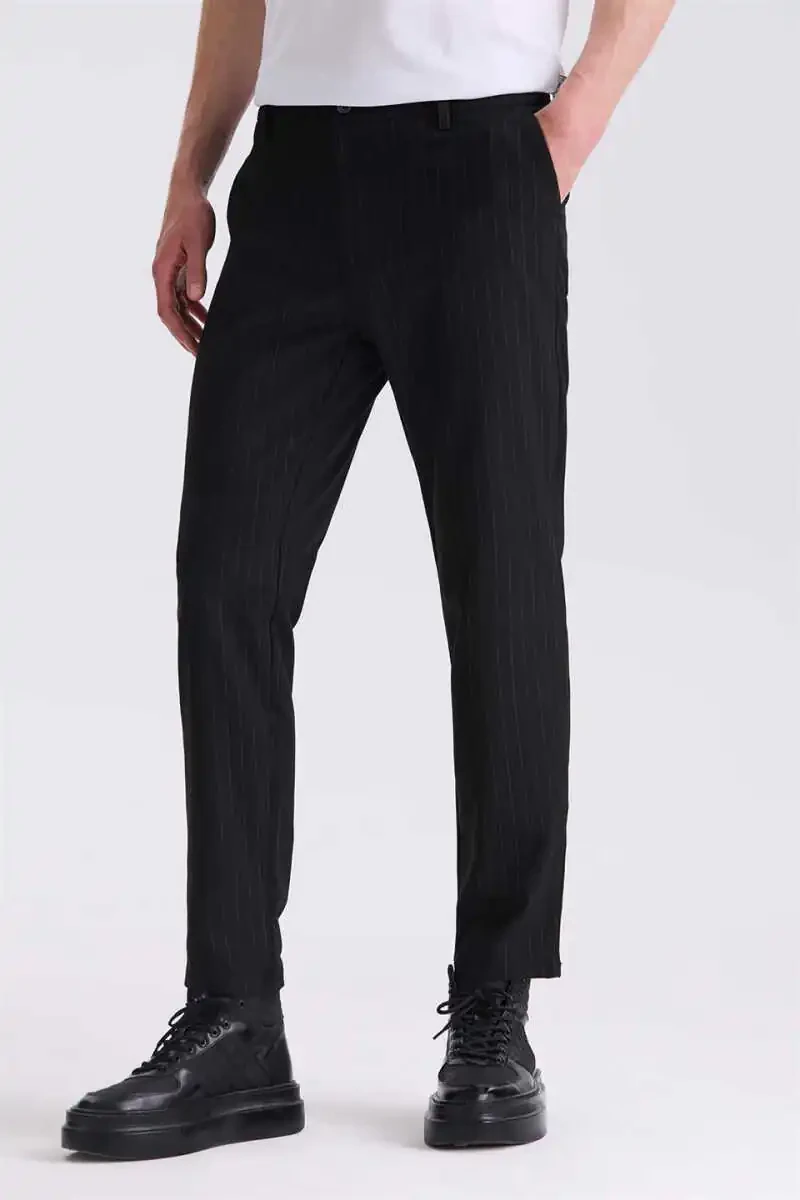 Our Black Slim Fit Striped Canvas Pants are a wardrobe essential. With their stylish and timeless stripes, these pants are crafted from a blend of 64% viscose, 34% polyester, and 2% elastane. This combination makes them both comfortable and durable. On a model measuring 187 cm in height, weighing 78 kg, and with a waist circumference of 80 cm, the 42 size is shown. Thanks to their loose fit and comfortable fabric, these pants are the perfect match for your daily combinations. Their black color makes them suitable for both formal and casual settings. Order these pants today and enjoy the quality materials and craftsmanship for years to come!