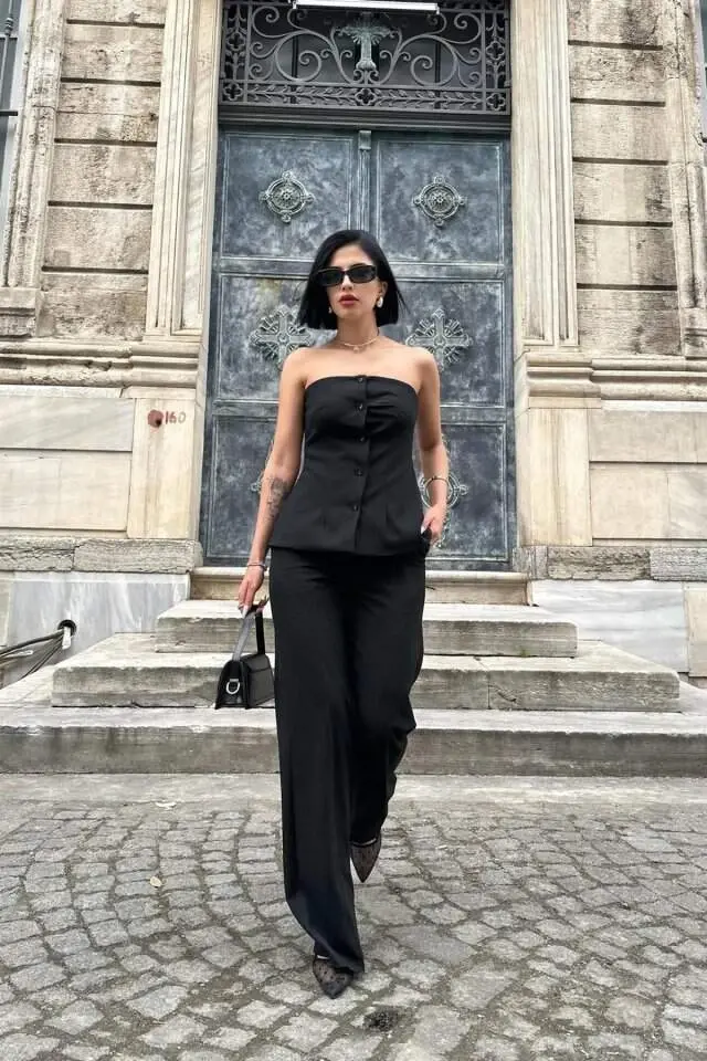 Experience elegance and comfort together with the Black Strapless Buttoned Crop and Pants Set. This eye-catching set is a perfect choice for both everyday wear and special events. The strapless crop top elegantly emphasizes your body lines, while the button details add a modern touch to the design. The high-waisted pants offer both a stylish look and all-day comfort. The size M/38 on the model shows that it has an ideal fit. You can achieve a flawless look by choosing the one that suits your body. This set is a candidate to be an indispensable part of your wardrobe. Whether you create a stylish combination with heels or a more comfortable style with sneakers. You will attract attention in any case. Combining the nobility of black and the elegance of modern design, this set will add confidence and style to you. The model's height of 165 cm, weight of 55 kg, chest of 90 cm, waist of 72 cm and hip measurements of 100 cm will give you an idea of how the product will look on you. The quality of its fabric and the care in its stitching details offer a long-lasting use. This set is not just a piece of clothing, but also a style statement. Choose the Black Strapless Buttoned Crop and Pants Set to feel special and reflect your style. You can easily combine it with other pieces in your wardrobe and create different styles. Ideal for both daily elegance and special occasions, this set allows you to express your style anytime and anywhere. The button details make the crop top look modern and eye-catching, while the comfortable cut of the pants offers freedom of movement throughout the day. The timelessness of black and the modernity of the design come together to give you a unique style experience. When you wear this set, you will feel both stylish and comfortable. Every detail has been carefully thought out, making this set one of the most loved pieces in your wardrobe. The way it stands on the model reveals how stylish and modern the team is. Order the Black Strapless Buttoned Crop and Pants Set now to experience this elegance.