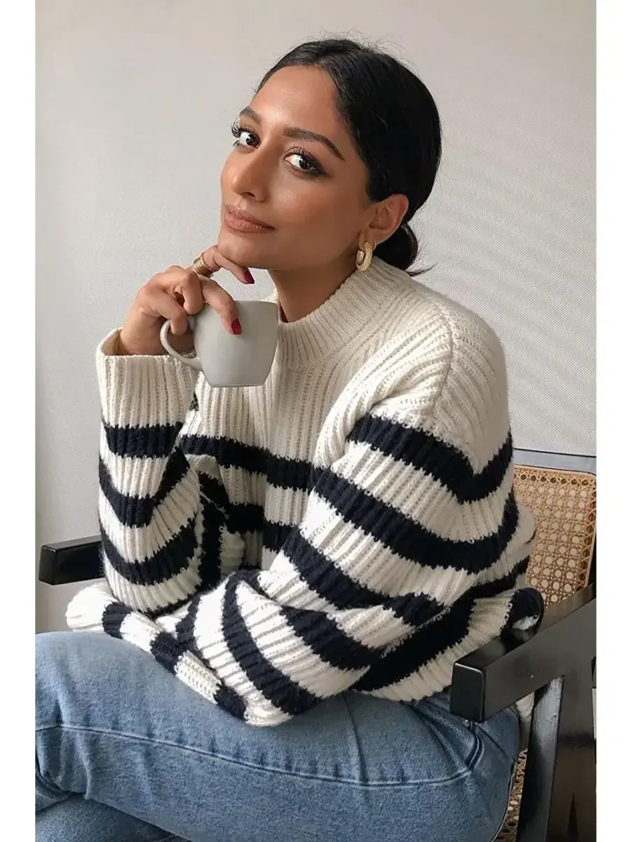 The timeless elegance of black and the modern touch of fine stripes will make it suitable for every style. The sweater is designed with a relaxed fit, providing a stylish look without restricting your freedom of movement. You can easily choose it for everyday life, for gatherings with friends or for special occasions.