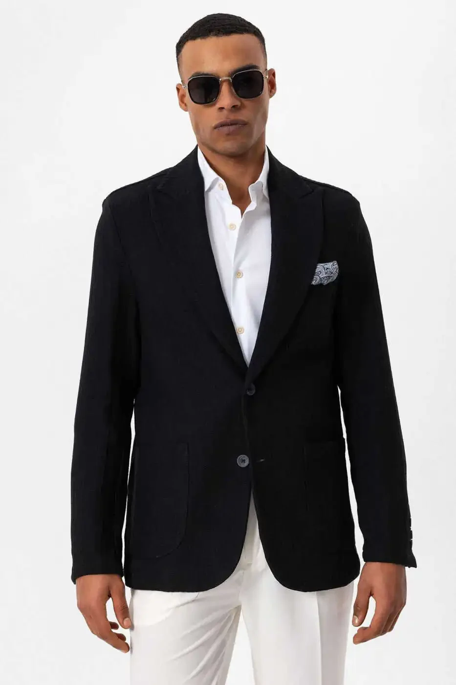 Our black unlined blazer jacket with flap pockets combines style and comfort, a must-have piece for every man's wardrobe. Whether you choose it for business meetings or casual outfits, this jacket will complement your style in any environment.