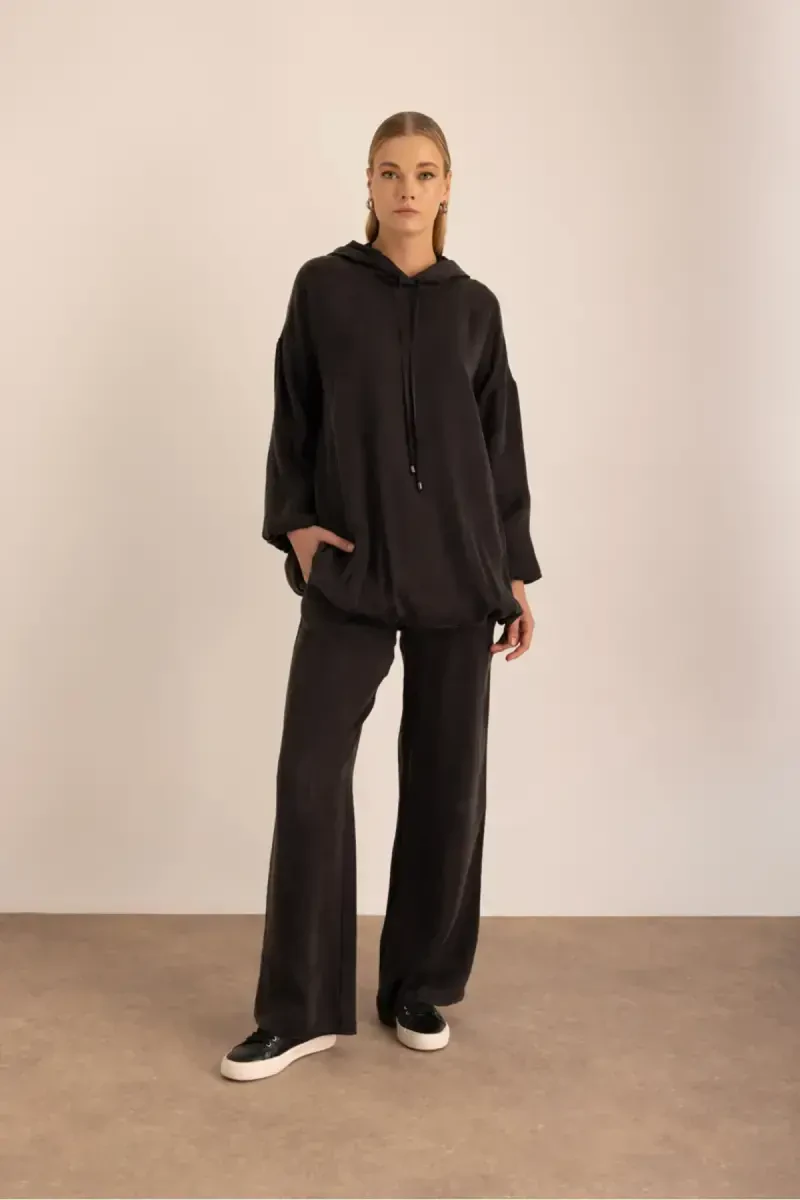 These stylish and comfortable pants will become a staple in your wardrobe. They easily combine with different top choices and provide a stylish look in every environment. If you're looking for both a comfortable and stylish look, the Black Knitted Drawstring Waist Pants are perfect for you. They require easy care and maintain their shape during prolonged use. Their comfortable texture supports you in all daily activities and offers a comfortable experience. With its modern lines and timeless design, it will retain its value in your wardrobe throughout the seasons.