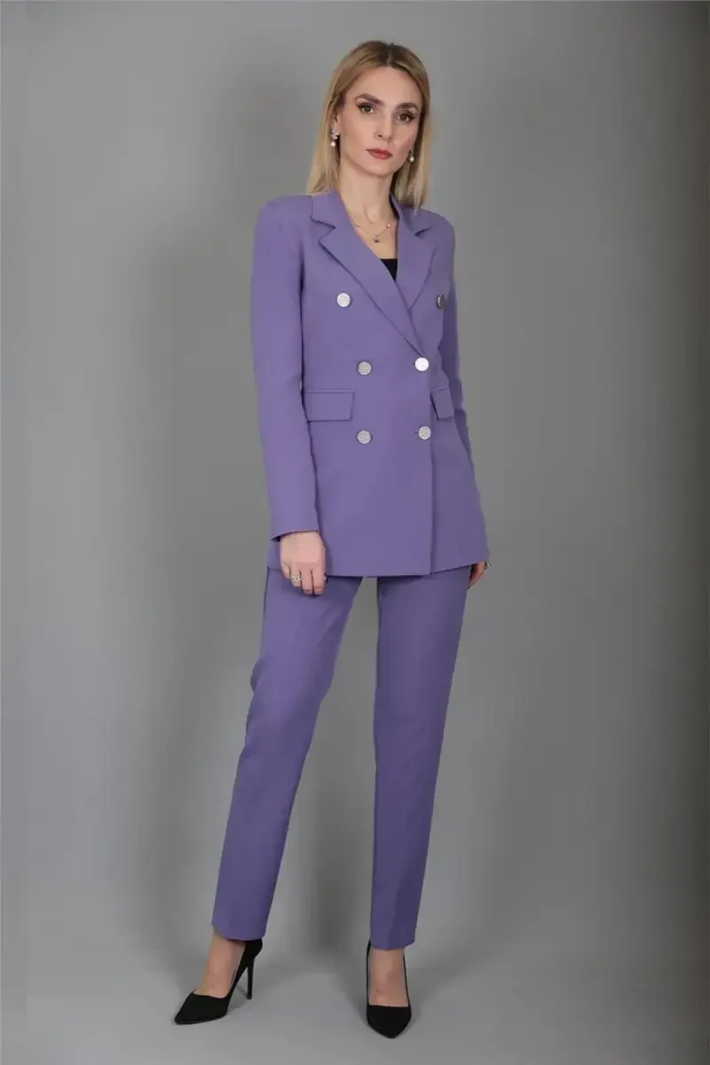 Meet our Blazer Jacket & Straight Leg Pants Set that combines elegance and comfort. This set, which attracts attention with the elegance of its lilac color, is an ideal option for both daily use and special occasions. It has been meticulously designed and manufactured by Önder Özsoy. This set, which is our own production, is produced with high quality materials and careful workmanship. The modern cut of the blazer jacket and the elegance of the straight leg trousers allow you to reflect your style in any environment. While the jacket attracts attention with its decorative flap pockets on the front and six buttons, the elastic waistband and side zippered design of the trousers offer all-day comfort. The lilac color helps you achieve a vibrant and energetic look, especially in the spring and summer months. The fabric of the suit is made of 40% cotton, 50% polyester and 10% elastane. This special blend gives the fabric durability, flexibility and breathability. While the cotton content provides a soft touch to your skin, polyester supports the fabric's long-lasting life. Elastane allows it to fit your body perfectly without restricting your freedom of movement. The set consists of two pieces: a blazer jacket and straight leg trousers. This combination can be easily complemented with different accessories and shoes. Whether you attend a stylish invitation with high heels or go for a daily stroll with sneakers, this suit will accompany you in any situation. Colors may vary due to light differences in studio shots, so the actual color of the product may differ slightly from what is shown on the screen. It is important to follow the washing instructions on the label to ensure the product has a long life. This suit will be an indispensable part of your wardrobe and will always make you feel stylish and confident. Remember, this special design is limited to only 100 pieces! Don't miss this opportunity and carry the magic of lilac on you. Order now to reflect your own style and attract attention!