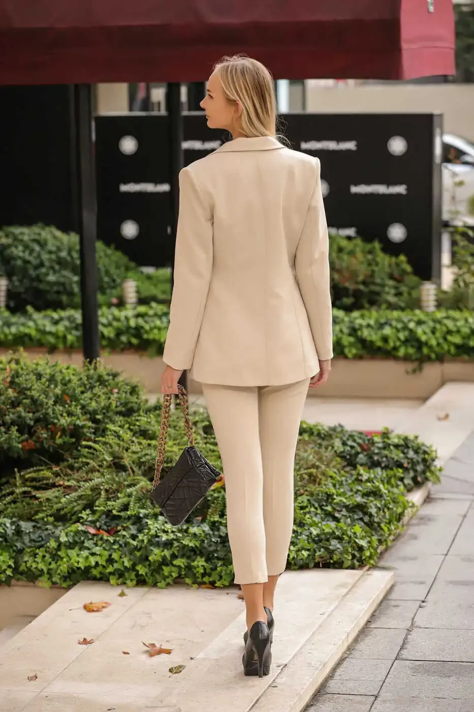 With this suit, you can achieve a stylish and comfortable look for any occasion, from job interviews to dinner parties. The combination of the blazer jacket and wide-leg trousers gives you a timeless style, while the quality fabrics offer all-day comfort. This suit, which combines style and comfort, will be one of the most valuable pieces in your wardrobe.