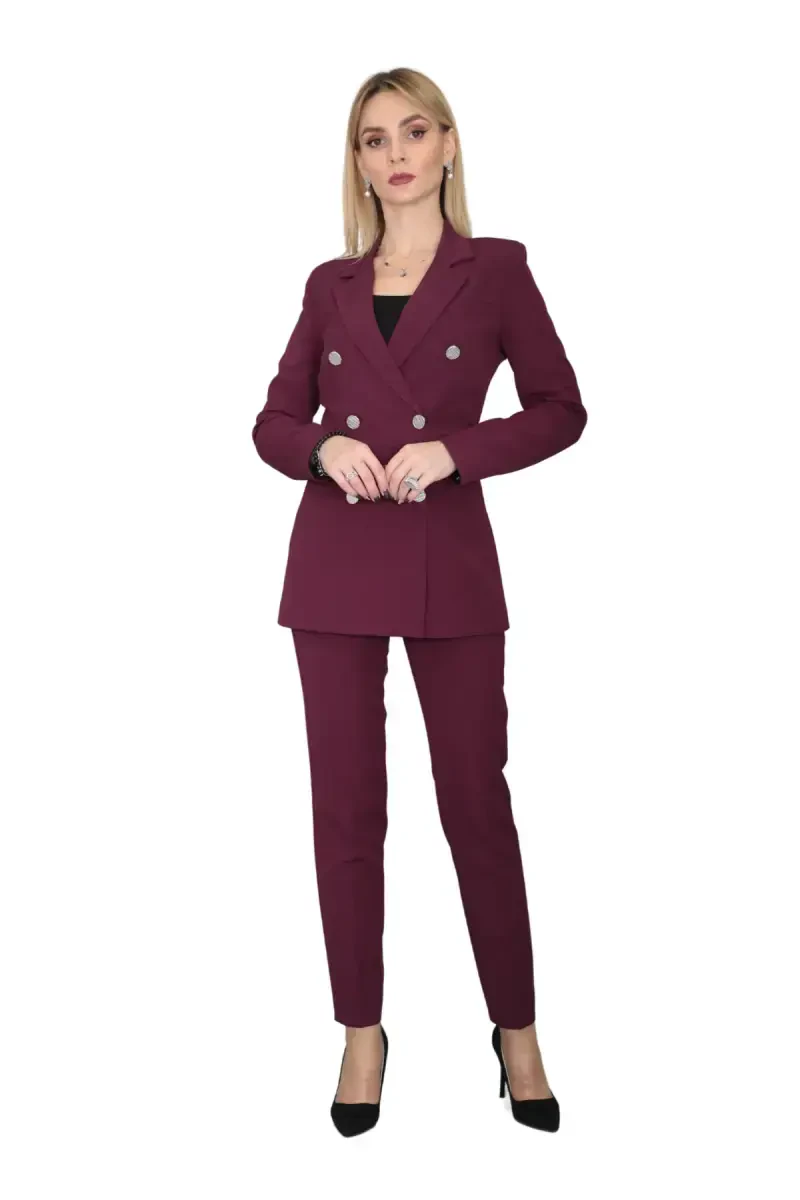 Our Blazer Jacket & Straight Leg Pants Suit is an ideal choice for women who want to achieve a modern and sophisticated look. The deep and impressive tone of plum color adds a different touch to the suit, while offering a suitable option for both daily and special occasions. The blazer jacket fits the body with its cut and creates a stylish silhouette. Button details and collar design highlight the elegance of the jacket. The straight leg pants attract attention with their cut that makes the legs look longer and thinner. Thanks to its high waist design, it offers both comfortable use and reveals body lines perfectly. The fabric of the suit is a special blend that is breathable and wrinkle-resistant, allowing you to feel comfortable all day long. In this way, it ensures that you look stylish and well-groomed at any time of the day. Plum color can be easily combined with different accessories and shoes, allowing you to create your own style. Whether you make a stylish combination with heels or a more comfortable look with sneakers, this suit will accompany you in any case. Our Blazer Jacket & Straight Leg Pants Suit prioritizes not only elegance but also quality and comfort. Every detail has been carefully thought out and carefully designed. This suit will be an indispensable part of your wardrobe and will always give you confidence. It is an excellent choice to reflect your own style and attract attention in any environment. Add elegance to your elegance with the magical tone of plum. Remember, this suit is not just a piece of clothing, it is also a stance. It will increase your self-confidence and make you feel stronger at every step. Order now and enrich your wardrobe with this unique piece.