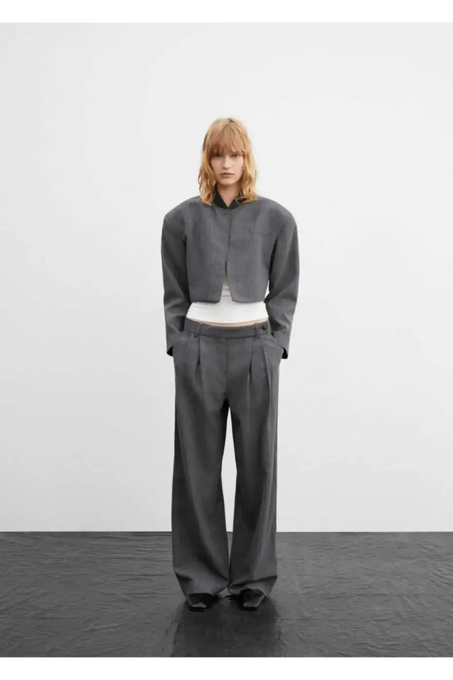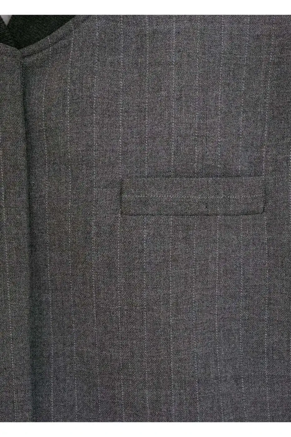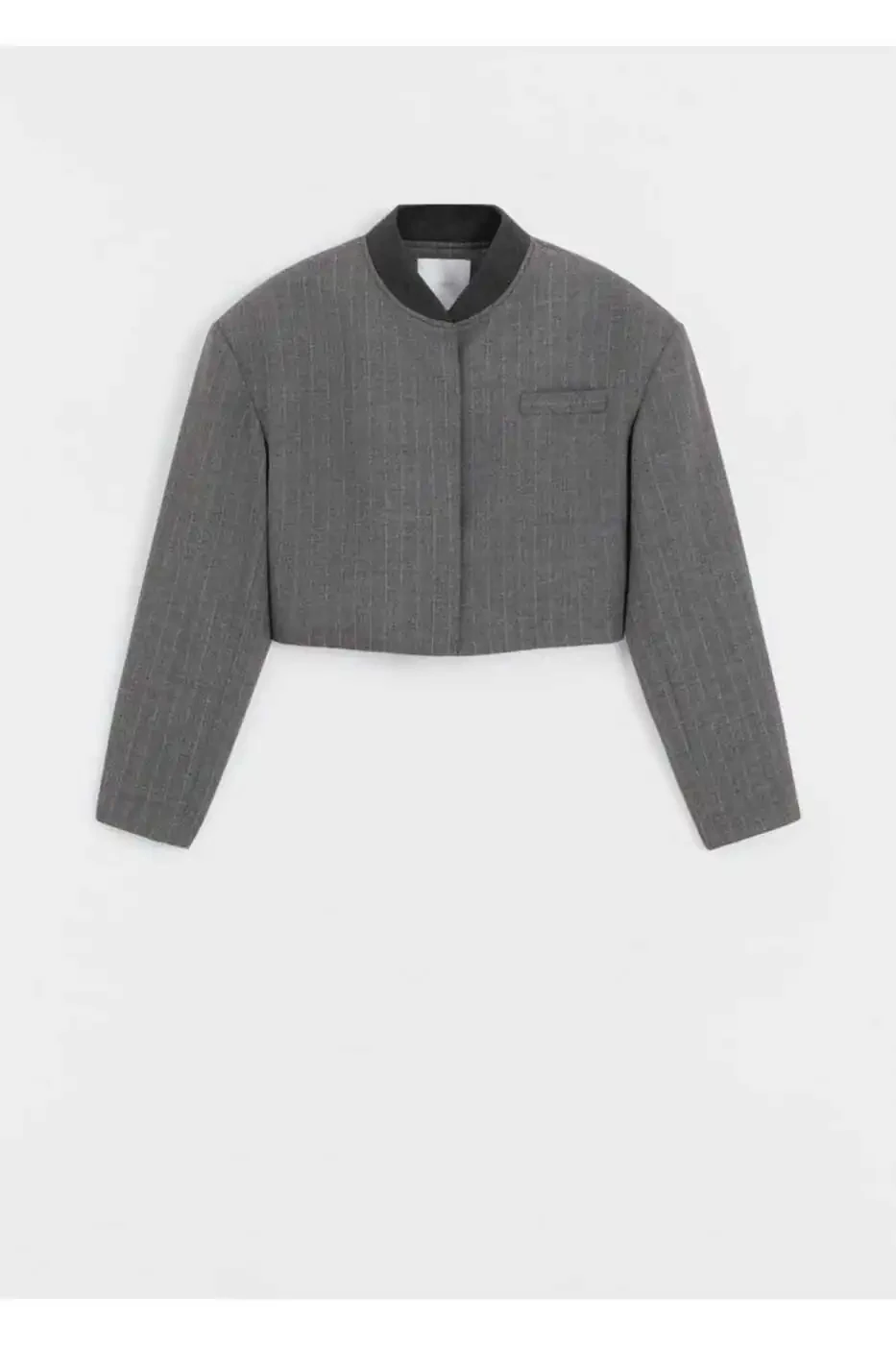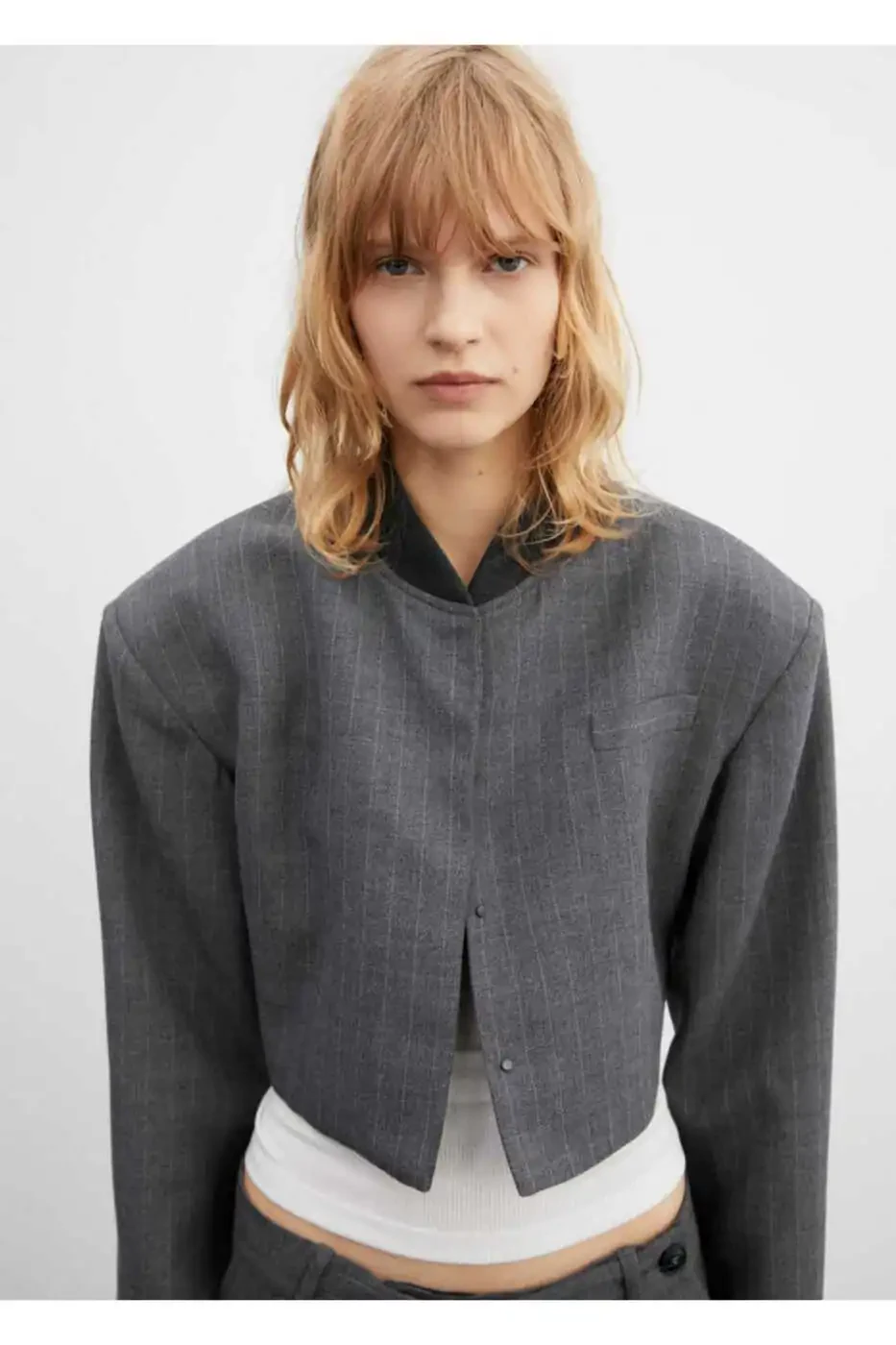 The blazer's micro-striped pattern adds a sophisticated touch. The bomber jacket collar creates a relaxed yet chic look. The long sleeves and chest welt pocket add practicality to the blazer.