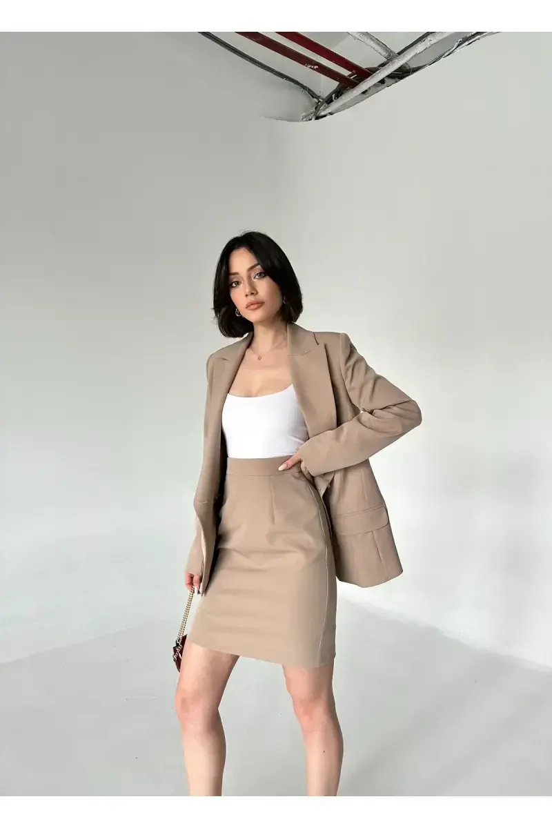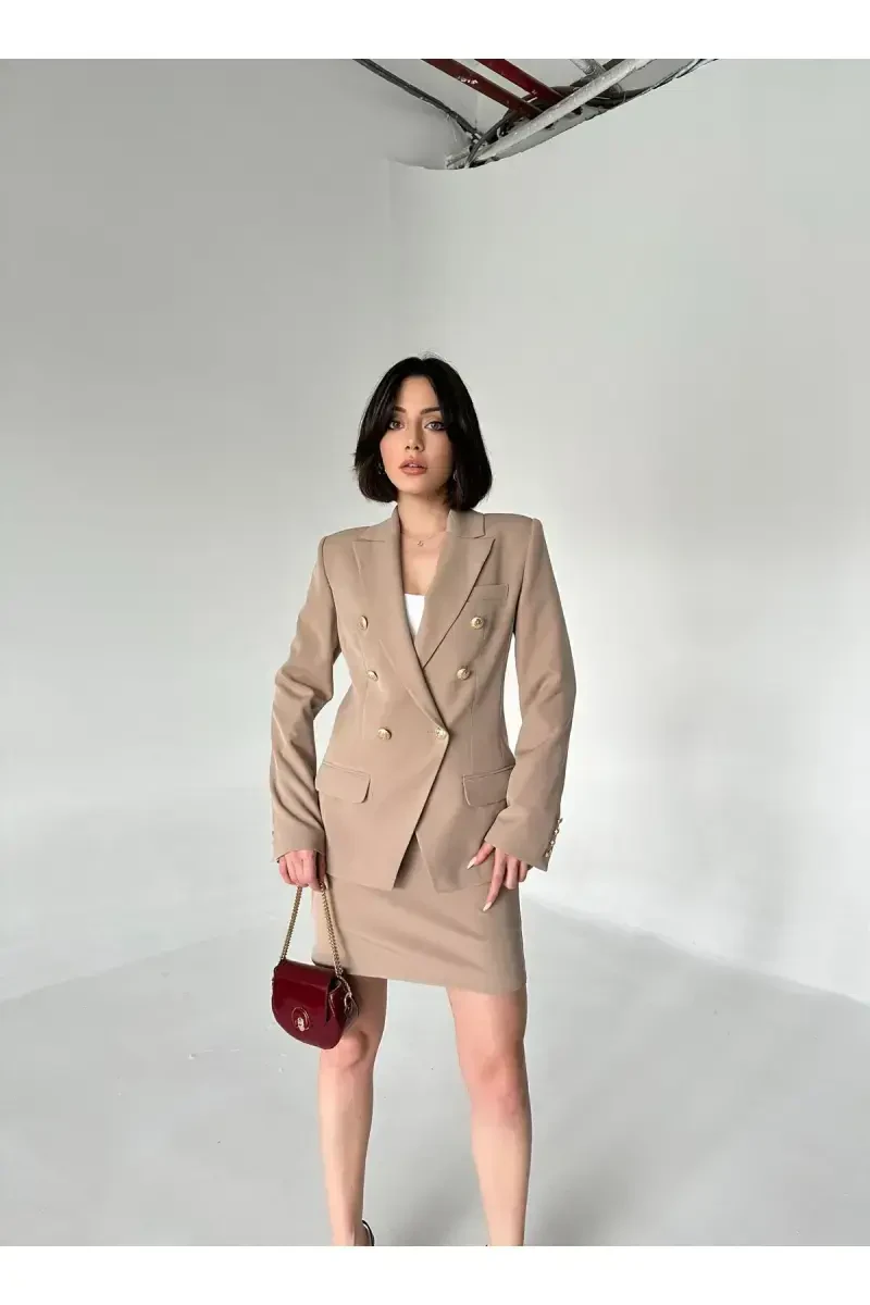 Костюм из юбки и блейзера с металлическими пуговицами, сочетающий в себе элегантность и изысканность, - это must-have для любого женского гардероба. Этот костюм с его элегантным кроем и современным дизайном поможет вам создать стильный образ для особых случаев или повседневных комбинаций.