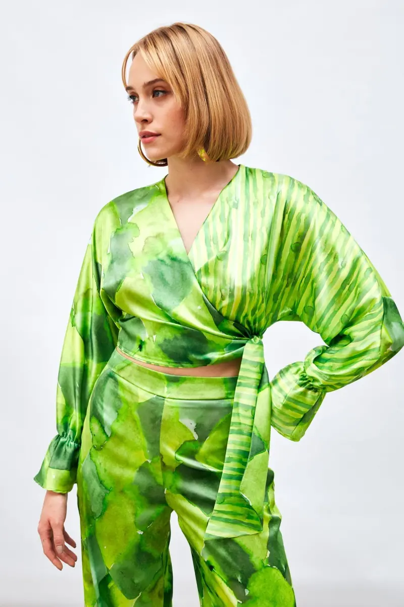 Сочетающая в себе стиль и комфорт, эта блузка с боковой завязкой станет незаменимой частью вашего гардероба. Яркий зеленый цвет и современный рисунок привлекают внимание. Блузка изготовлена из легкой и дышащей ткани. Свободный крой и дизайн с боковой завязкой делают ее подходящей для любого типа фигуры. Она позволит вам выглядеть стильно и элегантно в повседневной жизни, на особых мероприятиях или на работе.