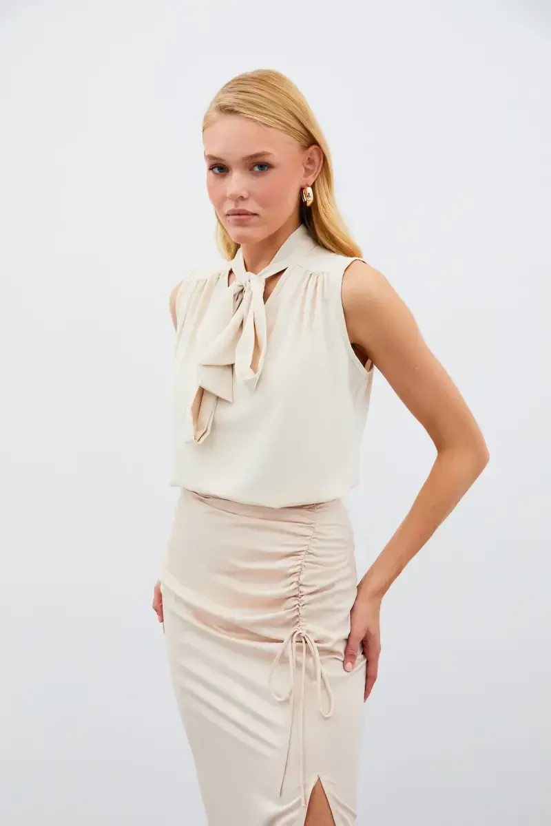 Идеально подходящая для элегантного и стильного образа, наша безрукавка с шарфом добавит изысканности вашему повседневному стилю. Эта блуза бежевого цвета подойдет к любому наряду и станет стильным выбором для особых случаев. Ее комфортная ткань и безрукавный дизайн позволят вам чувствовать себя прохладно и комфортно в жаркую погоду.