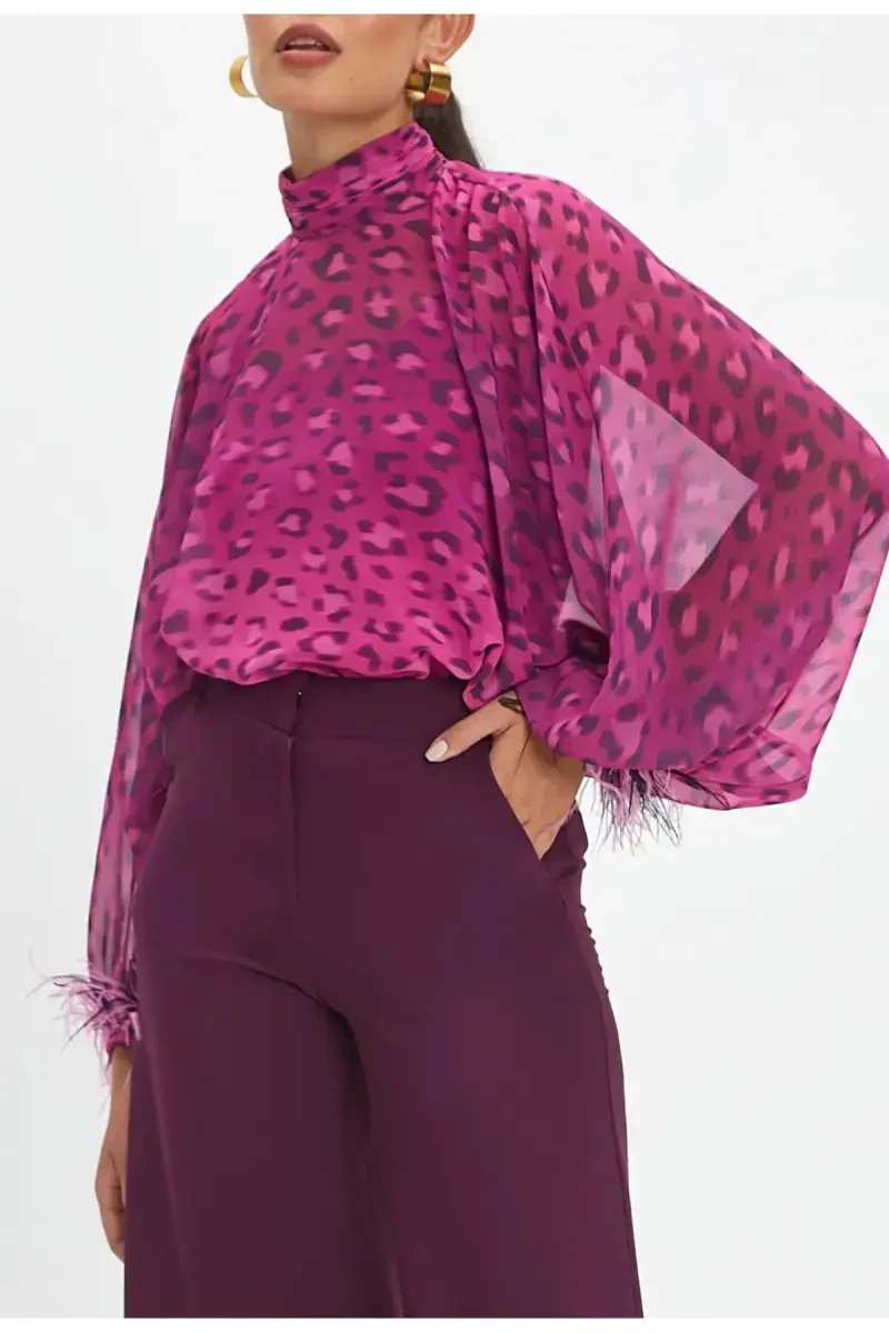 Блузка, Блузка с леопардовым принтом, Блузка цвета фуксии, Блузка с отделкой на рукавах, Женская блузка