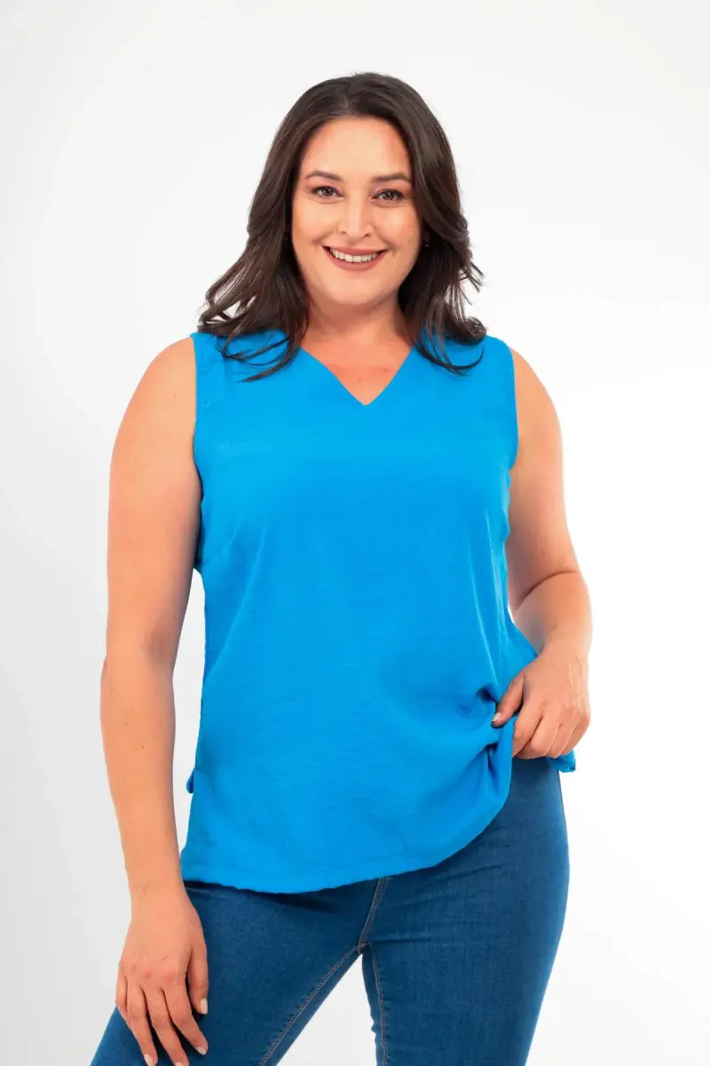 **Блузка-туника больших размеров с V-образным вырезом, разрезами по бокам и без рукавов, индиго**