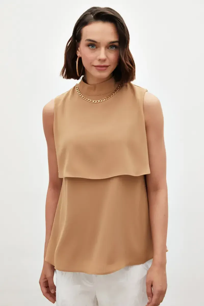 Блузка с воланами и аксессуарами - идеальный выбор для изящного и стильного образа. Эта блузка, которая подходит к любому стилю благодаря своему верблюжьему цвету, добавляет женственности благодаря своей драпировке, а детали аксессуаров придают вашему стилю элегантности.