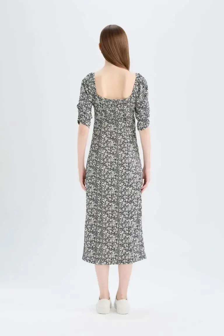 Облегающее миди-платье Bodycon с квадратным вырезом, цветочным рисунком и присборенными полурукавами - черное - станет одним из самых ярких предметов вашего гардероба! Это элегантное и стильное платье - идеальный выбор как для повседневной носки, так и для особых мероприятий. Присборенная текстура и цветочный узор придают платью неповторимый вид, а облегающий крой идеально подчеркивает ваш силуэт. Благородство черного цвета в сочетании с яркостью цветочного узора создают изысканный и современный образ. Квадратный вырез элегантно подчеркивает ваше декольте, добавляя женственности. Полурукава обеспечивают стильный и удобный вариант ношения, не ограничивая вашу свободу движений. Длина миди легко сочетается с любой обувью и аксессуарами, предоставляя вам свободу выражать свой стиль. Состав ткани платья: 95% полиэстер и 5% эластан. Благодаря этому оно отличается прочностью и эластичностью. Эластичная структура обеспечивает комфорт в течение всего дня, идеально облегая ваше тело. Отсутствие подкладки обеспечивает воздухопроницаемость, особенно в теплую погоду, повышая ваш комфорт. Это платье, идеально подходящее для весенних и летних месяцев, позволит вам чувствовать себя комфортно в жаркую погоду, не жертвуя при этом элегантностью. Вы можете создать повседневный образ, сочетая его со спортивной обувью для повседневной носки, или ослепить всех, дополнив его туфлями на каблуках и стильной сумкой для особых мероприятий. Это платье не только стильно выглядит, но и предлагает практичный вариант использования. Отсутствие карманов не нарушает элегантный силуэт платья, а легкость надевания и снимания позволяет сэкономить время. Возможность стирки при 30 градусах с вещами похожего цвета облегчает уход за ним и обеспечивает длительный срок службы. Вы можете легко выбрать наиболее подходящий для вас размер, взяв за основу размеры модели (Рост: 175 см, Грудь: 82 см, Талия: 62 см, Бедра: 92 см) и размер S на ней. Благодаря размерам, подходящим для всех размеров (S, M, L, XL), каждый сможет найти для себя подходящий вариант. Облегающее миди-платье Bodycon с квадратным вырезом, цветочным рисунком и присборенными полурукавами - это идеальное сочетание стиля, комфорта и качества, которое станет вашим любимым предметом гардероба.