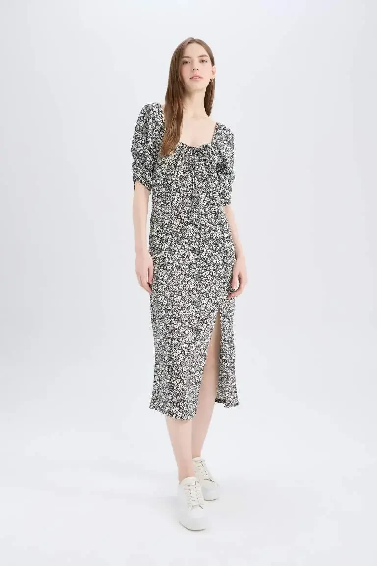 Bodycon Body-Hugging Square Neck Floral Patterned Crinkle Half Sleeve Midi Dress - Black is a candidate to be one of the most striking pieces of your wardrobe! This elegant and stylish dress is a perfect option for both daily use and special events. The crinkle texture and floral pattern add a unique touch to the dress, while the body-hugging cut perfectly reveals your silhouette. The elegance of black and the vibrancy of the floral pattern combine to offer a sophisticated and modern look. The square neck detail adds a feminine touch by elegantly emphasizing your décolleté. The half-sleeve design offers both a stylish and comfortable use, so your freedom of movement is not restricted. The midi length can be easily combined with all kinds of shoes and accessories, thus providing the freedom to reflect your style. The fabric content of the dress is 95% polyester and 5% elastane. Thanks to this, it has both a durable and flexible structure. Its flexible structure ensures that you are comfortable all day long and fits your body perfectly. Its unlined construction increases your comfort by providing breathability, especially in hot weather. Ideal for spring and summer months, this dress allows you to be comfortable without sacrificing your elegance in hot weather. You can achieve a casual elegance by combining it with sneakers for daily use, or you can dazzle by completing it with heels and a stylish bag for special occasions. This dress not only looks stylish but also offers practical use. The pocketless design does not spoil the elegant silhouette of the dress, while its easy-to-wear and take-off structure saves you time. The ability to wash at 30 degrees with similar colors makes it easy to maintain and offers long-lasting use. You can easily choose the most suitable one for your size by taking the model's measurements (Height: 175 cm, Bust: 82 cm, Waist: 62 cm, Hips: 92 cm) and the S size on it as a reference. Thanks to its sizes suitable for every body (S, M, L, XL), it is possible for everyone to find a suitable option. Bodycon Body-Hugging Square Neck Floral Patterned Crinkle Half Sleeve Midi Dress is a candidate to be the favorite piece of your wardrobe by offering elegance, comfort and quality together.