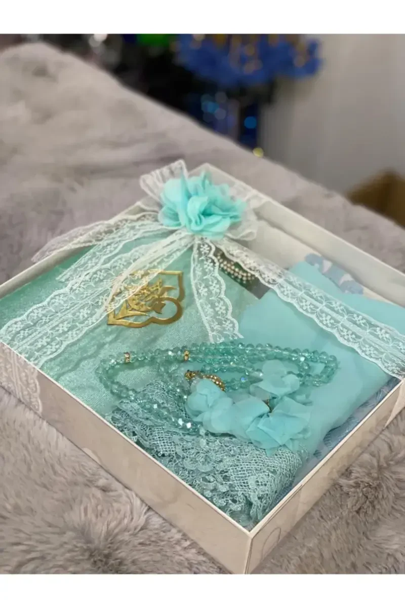 bohça seccade seti, turkuaz seccade, hediye seccade, nişan hediyesi, söz hediyesi, mevlid hediyesi, doğum günü hediyesi, ev hediyesi, tesbih, seccade bohça seti