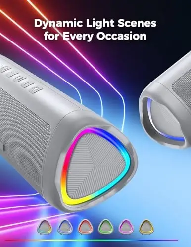 [Immersive Sound Experience & Dual Connectivity] Experience unparalleled sound quality with this wireless Bluetooth speaker's 2 drivers and advanced technology that delivers powerful, well-balanced sound with minimal distortion. Connect two speakers together to create an immersive stereo sound experience and fill any room with powerful sound. Perfect for gaming, music, and movie playback [Tough & Weather-Resistant] Engineered to handle rough use and adverse weather conditions, this speaker features a durable design and an IPX5 rating for protection against water splashes and spills. It's an ideal choice for outdoor events, and is perfect for use at parties, at the pool, on the beach, while camping or hiking, and more [Long-lasting Playtime & Extended Bluetooth Connectivity] Experience extended playtime with up to 20 hours(50% Vol and light off) per charge and extended wireless range with Bluetooth 5.3, reaching up to 33 feet from your device. The multicolor lights on the speaker can also be turned off with a simple button press to save the battery and adapt to your needs. Keep in mind that the actual playtime can vary depending on volume level, audio content, and usage [Vibrant Light Effects] Bring a new level of excitement to your party with the dynamic multi-color light show that syncs to the beat of the music, you can easily customize the light effects to suit your preference by simply pressing the Light button. Make any gathering more memorable with these visually stunning light effects that will elevate the atmosphere [Everything You Need] The package includes 1 waterproof Bluetooth speaker (Item Dimensions D x W x H: 7.87"D x 2.76"W x 2.81"H, Weight: 1.28lb), 1 Type-C charging cable, and a quick start guide, all backed by lifetime technical support. The built-in microphone allows for hands-free phone calls and you can also play music from other devices using the AUX jack (not included). It's a perfect gift for men and women. It is also suitable as white elephant gifts for adult, stocking stuffers for men and women, Christmas gifts,birthday gifts, mothers day gifts,fathers day gifts,Valentine's Day,mens gifts,and various anniversary gifts for him.