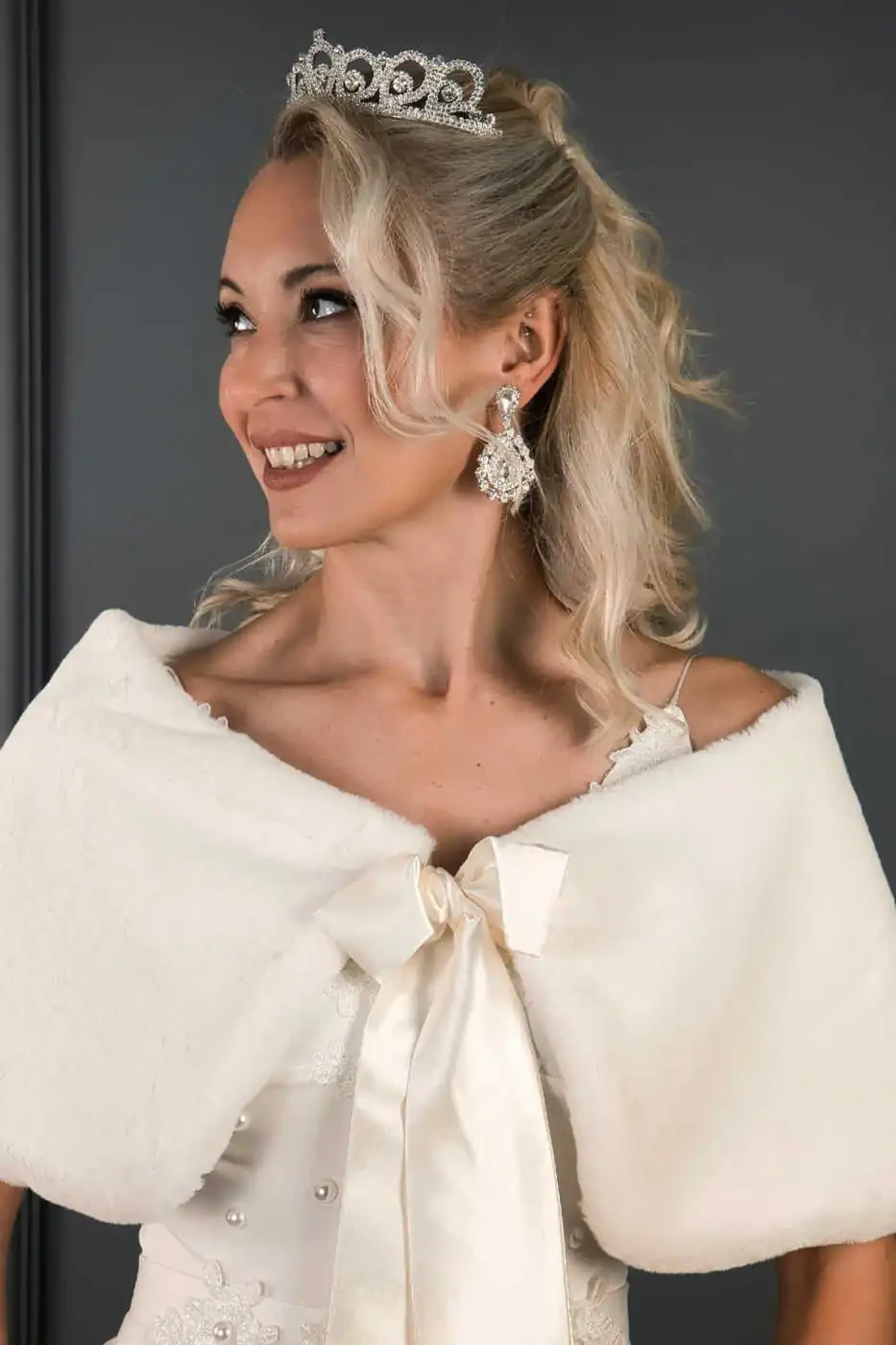 Дополните свой стиль нашим бридальным болеро из меха с атласным бантом цвета слоновой кости, чтобы сделать этот особенный день незабываемым!