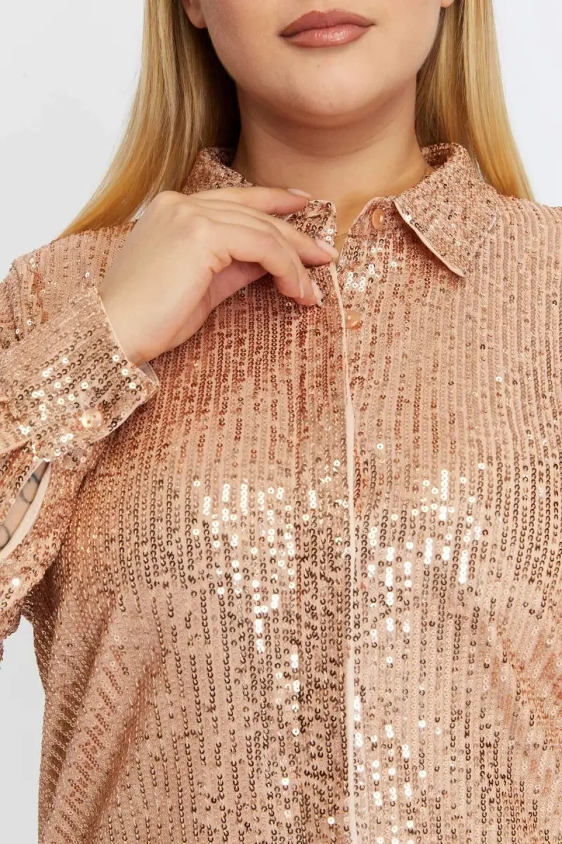 Добейтесь идеального сочетания блеска и элегантности с блузкой большого размера с блестками и пайетками цвета бронзы. Эта привлекательная блузка сочетает в себе тепло бронзового цвета и завораживающий блеск пайеток, что сделает вас заметной в любой обстановке. Этот предмет, который подчеркнет ваш стиль в любой момент, от особых мероприятий до шикарных ужинов, станет одним из самых ценных предметов вашего гардероба.Удобный крой блузки обеспечивает комфорт в течение всего дня, а современный дизайн позволяет не жертвовать элегантностью. Благодаря крою, который облегает фигуру, но не сковывает свободу движений, вы будете чувствовать себя одновременно комфортно и элегантно. Вы можете создавать разные стили, комбинируя ее с юбками или брюками, и свободно выражать свой стиль.Блузка большого размера с блестками и пайетками цвета бронзы выделяется не только своим внешним видом, но и качеством. Ткань из 100% полиэстера обеспечивает длительный срок службы и простоту в уходе. Текстура ткани наилучшим образом отражает блеск пайеток, придавая блузке дополнительную выразительность.Эта блузка идеально подходит не только для особых случаев, но и для того, чтобы добавить блеска вашему повседневному стилю. Вы можете создать шикарный дневной образ, сочетая ее с джинсами и туфлями на каблуках, или подготовиться к вечеру с кожаной юбкой и эффектными аксессуарами. Короче говоря, блузка большого размера с блестками и пайетками цвета бронзы - это универсальный предмет одежды, который подходит для любого стиля и любого случая.Учитывая, что рост модели составляет 1,86 м, объем груди - 115 см, объем талии - 88 см, объем бедер - 120 см, и она носит образец размера 44, понятно, что блузка идеально подходит для женщин с пышными формами. Длина 78 см обеспечивает как стильный, так и практичный дизайн. Эта блузка, идеально подходящая для зимнего сезона, согреет вас в холодную погоду, не жертвуя при этом элегантностью.Почувствуйте себя особенной и очаруйте всех своим блеском с блузкой большого размера с блестками и пайетками цвета бронзы. Эта блузка - не просто одежда, это способ самовыражения. Это идеальный выбор, чтобы отразить свой стиль и повысить уверенность в себе.