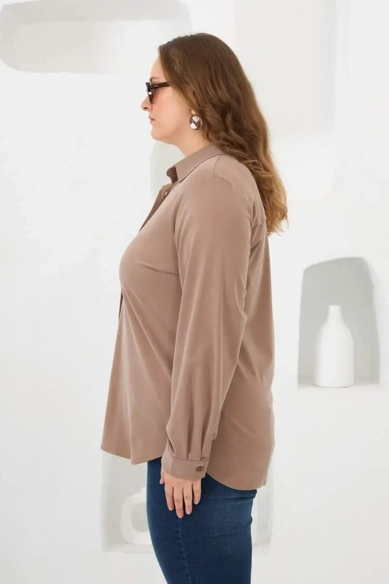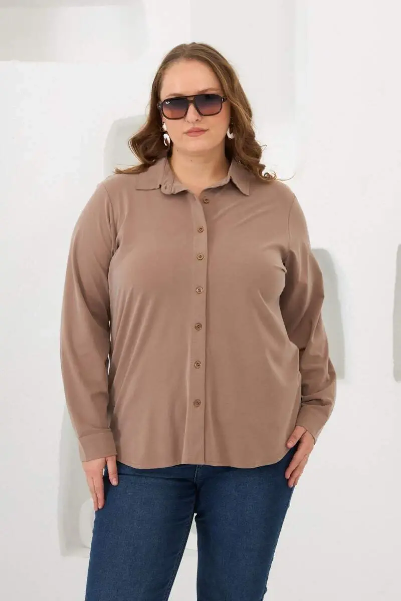Büyük beden giyimde şıklığı ve konforu bir araya getiren Vizon Rengi Gömleğimiz, gardırobunuzun vazgeçilmez parçası olmaya aday! İster özel bir davette, ister günlük kullanımda, her ortamda zarif ve rahat hissetmenizi sağlayacak bu gömlek, dokuma kumaşı ve özenli tasarımıyla dikkat çekiyor. Vizonun sıcak ve sofistike tonu, her ten rengine uyum sağlarken, gömleğin kesimi büyük beden kadınların vücut hatlarını en güzel şekilde ortaya çıkaracak şekilde tasarlanmıştır. Gün boyu rahat hareket etmenizi sağlayan kumaş içeriği, %55 Liyosel, %33 Polyester ve %12 Elastan'dan oluşmaktadır. Liyosel'in doğal dokusu cildinize nefes aldırırken, polyester kumaşa dayanıklılık kazandırır ve elastan ise esneklik sağlayarak gün boyu konfor sunar. 75 cm uzunluğu ile hem pantolonlarla hem de eteklerle mükemmel bir uyum yakalayan bu gömlek, stilinizi tamamlayacak ideal bir seçimdir. Modelimiz 1,78 boyunda, 89 kilo ağırlığında, 103 cm göğüs, 89 cm bel ve 110 cm basen ölçülerine sahip olup, 44 beden numunesini giymektedir. Büyük beden giyimde doğru bedeni bulmak bazen zorlayıcı olabilir, ancak bu gömleğin kalıbı, büyük beden ölçülerine uygun olarak tasarlanmıştır ve üzerinizde mükemmel duracaktır. Şıklığı ve rahatlığı bir arada arayan büyük beden kadınlar için özel olarak tasarlanan bu gömlek, her mevsim giyilebilir yapısıyla da öne çıkıyor. Yazın tek başına, kışın ise bir ceket veya hırka ile kombinleyerek kullanabilirsiniz. İş hayatında profesyonel bir görünüm elde etmek veya günlük şıklığınızı tamamlamak için ideal bir parça olan Vizon Rengi Büyük Beden Gömleğimiz, kaliteli kumaşı ve şık tasarımıyla gardırobunuzun en sevilen parçalarından biri olacak. Bu gömleği giydiğinizde kendinizi hem rahat hem de şık hissedeceksiniz. Kombinlemesi kolay olan bu gömlek, farklı tarzlara uyum sağlayabilen çok yönlü bir parçadır. İster klasik bir tarzı benimseyin, ister daha modern ve trend bir görünüm yaratmak isteyin, bu gömlek size eşlik edecektir. Vizon renginin asilliği, gömleğin kesimi ve kumaşının kalitesi bir araya geldiğinde, ortaya şık ve zarif bir görünüm çıkmaktadır. Büyük beden giyimde hem şık hem de rahat olmak isteyen kadınlar için bu gömlek, mükemmel bir seçim olacaktır. Kendinizi iyi hissetmek ve stilinizi yansıtmak için bu gömleği mutlaka denemelisiniz.
