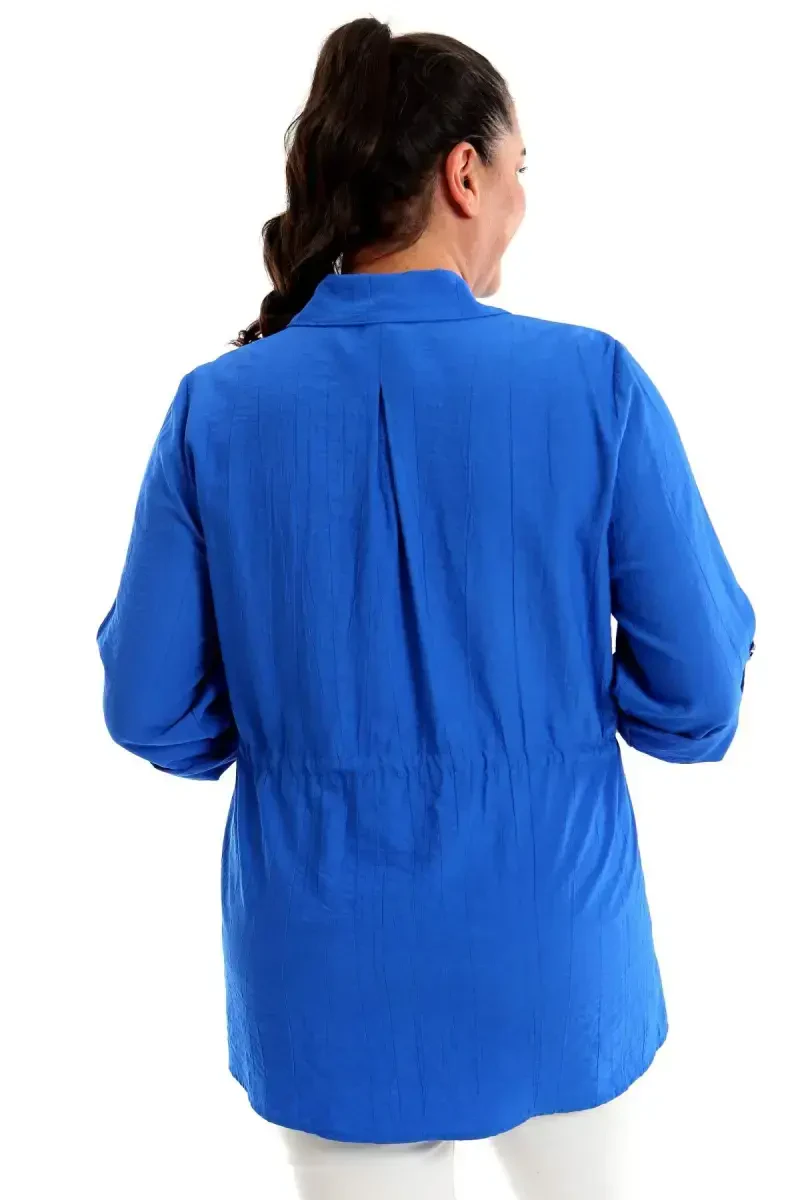 Удлиненный блейзер с завязками на талии большого размера индиго подчеркивает ваш мужественный стиль своим классическим кроем и отложным воротником. Текстура куртки также заслуживает внимания, и она создает потрясающий образ с погонами и деталями пуговиц на рукавах.