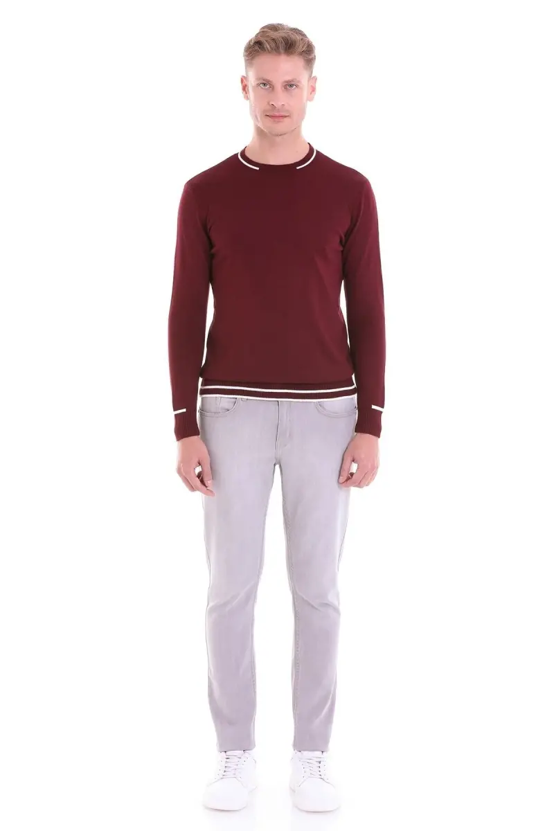 Bordo Comfort Fit Desenli Bisiklet Yaka Yünlü Yün Kazak-A.Bordo