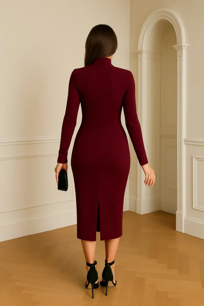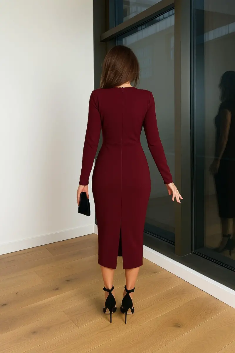 BORDO RENK MİDİ BOY BROŞ DETAYLI YIRTMAÇLI UZUN KOLLU ABİYE ELBİSE 771-Bordo771