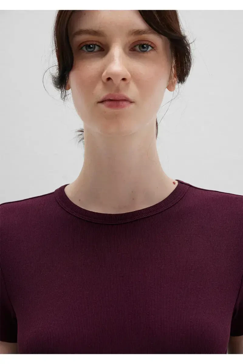 бордовая футболка, базовая футболка, приталенная футболка, хлопковая футболка, футболка с круглым вырезом, футболка с коротким рукавом, повседневная футболка, женская футболка, облегающая футболка, повседневная футболка